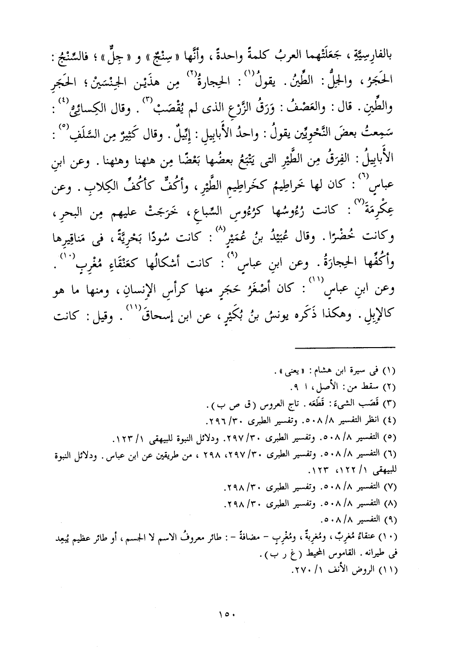 بِالْفَارِسِيَّةِ جَعَلَتْهُمَا الْعَرَبُ كَلِمَةً وَاحِدَةً، وَإِنَّهَا " سِنْجٌ " وَ " جِلٌّ " فَالسِّنْجُ: الْحَجَرُ وَالْجِلُّ: الطِّينُ يَقُولُ: الْحِجَارَةُ مِنْ هَذَيْنَ الْجِنْسَيْنِ الْحَجَرُ وَالطِّينُ قَالَ: وَالْعَصْفُ: وَرَقُ الزَّرْعِ الَّذِي لَمْ يُقْصَبْ، وَقَالَ الْكِسَائِيُّ: سَمِعْتُ بَعْضَ النَّحْوِيِّينَ يَقُولُ: وَاحِدُ الْأَبَابِيلِ إِبِّيلٌ، وَقَالَ كَثِيرُونَ مِنَ السَّلَفِ: الْأَبَابِيلُ الْفِرَقُ مِنَ الطَّيْرِ الَّتِي يَتْبَعُ بَعْضُهَا بَعْضًا مِنْ هَاهُنَا، وَهَاهُنَا، وَعَنِ ابْنِ عَبَّاسٍ: كَانَ لَهَا خَرَاطِيمُ كَخَرَاطِيمِ الطَّيْرِ، وَأَكُفٌّ كَأَكُفِّ الْكِلَابِ، وَعَنْ عِكْرِمَةَ: كَانَتْ رُءُوسُهَا كَرُءُوسِ السِّبَاعِ خَرَجَتْ عَلَيْهِمْ مِنَ الْبَحْرِ وَكَانَتْ خُضْرًا، وَقَالَ عُبَيْدُ بْنُ عُمَيْرٍ: كَانَتْ سُودًا بَحْرِيَّةً فِي مَنَاقِيرِهَا وَأَكُفِّهَا الْحِجَارَةُ، وَعَنِ ابْنِ عَبَّاسٍ: كَانَتْ أَشْكَالُهَا كَعَنْقَاءِ مُغْرِبٍ، وَعَنِ ابْنِ عَبَّاسٍ: كَانَ أَصْغَرُ حَجَرٍ مِنْهَا كَرَأْسِ الْإِنْسَانِ، وَمِنْهَا مَا هُوَ كَالْإِبِلِ، وَهَكَذَا ذَكَرَهُ يُونُسُ بْنُ بُكَيْرٍ عَنِ ابْنِ إِسْحَاقَ، وَقِيلَ كَانَتْ