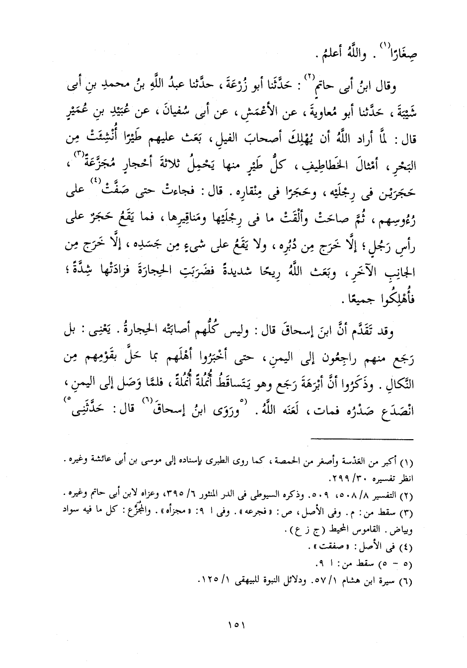 وَقَالَ ابْنُ أَبِي حَاتِمٍ: حَدَّثَنَا أَبُو زُرْعَةَ حَدَّثَنَا عَبْدُ اللَّهِ بْنُ مُحَمَّدِ بْنِ أَبِي شَيْبَةَ حَدَّثَنَا أَبُو مُعَاوِيَةَ عَنِ الْأَعْمَشِ عَنْ أَبِي سُفْيَانَ عَنْ عُبَيْدِ بْنِ عُمَيْرٍ قَالَ: لَمَّا أَرَادَ اللَّهُ أَنْ يُهْلِكَ أَصْحَابَ الْفِيلِ بَعَثَ عَلَيْهِمْ طَيْرًا أُنْشِئَتْ مِنَ الْبَحْرِ أَمْثَالَ الْخَطَاطِيفِ كُلُّ طَيْرٍ مِنْهَا يَحْمِلُ ثَلَاثَةَ أَحْجَارٍ مُجَزَّعَةً، حَجَرَيْنِ فِي رِجْلَيْهِ، وَحَجَرًا فِي مِنْقَارِهِ قَالَ: فَجَاءَتْ حَتَّى صَفَّتْ عَلَى رُءُوسِهِمْ، ثُمَّ صَاحَتْ وَأَلْقَتْ مَا فِي رِجْلَيْهَا، وَمَنَاقِيرِهَا فَمَا يَقَعُ حَجَرٌ عَلَى رَأْسِ رَجُلٍ إِلَّا خَرَجَ مِنْ دُبُرِهِ وَلَا يَقَعُ عَلَى شَيْءٍ مِنْ جَسَدِهِ إِلَّا خَرَجَ مِنَ الْجَانِبِ الْآخَرِ، وَبَعَثَ اللَّهُ رِيحًا شَدِيدَةً فَضَرَبَتِ الْحِجَارَةَ فَزَادَتْهَا شِدَّةً فَأُهْلِكُوا جَمِيعًا.