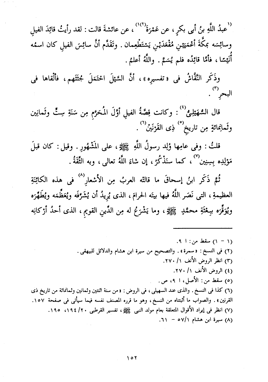 قُلْتُ: وَفِي عَامِهَا وُلِدَ رَسُولُ اللَّهِ صَلَّى اللَّهُ عَلَيْهِ وَسَلَّمَ عَلَى الْمَشْهُورِ، وَقِيلَ: كَانَ قَبْلَ مَوْلِدِهِ بِسِنِينَ، كَمَا سَنَذْكُرُ إِنْ شَاءَ اللَّهُ تَعَالَى، وَبِهِ الثِّقَةُ.