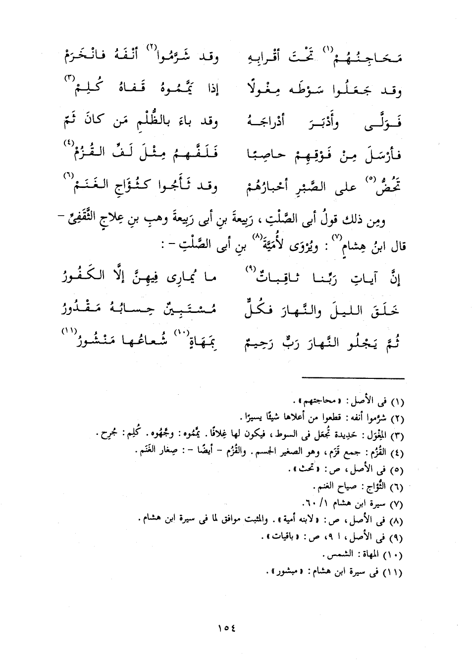 وَمِنْ ذَلِكَ قَوْلُ أَبِي الصَّلْتِ رَبِيعَةَ بْنِ أَبِي رَبِيعَةَ وَهْبِ بْنِ عِلَاجٍ الثَّقَفِيِّ قَالَ ابْنُ هِشَامٍ وَيُرْوَى لِأُمَيَّةَ بْنِ أَبِي الصَّلْتِ