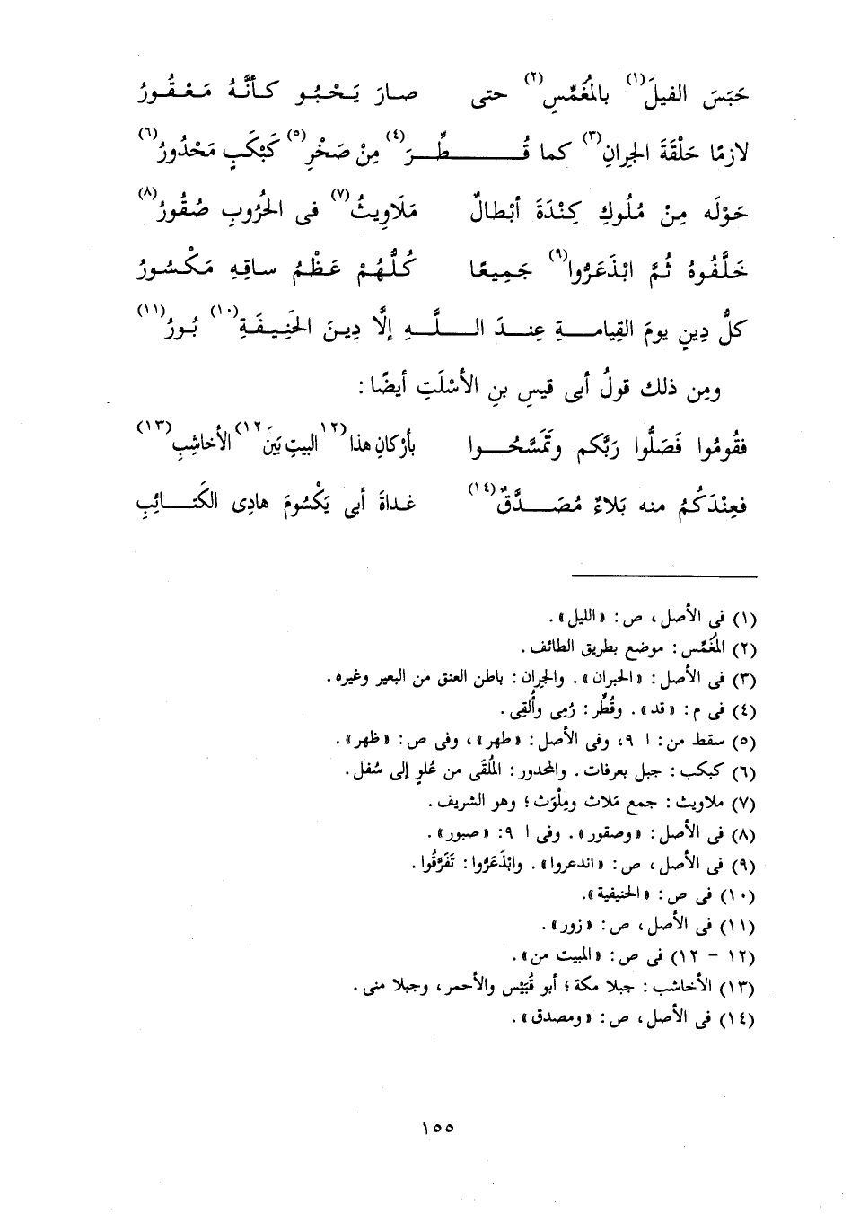 حُبِسَ الْفِيلُ بِالْمُغَمِّسِ حَتَّى صَارَ يَحْبُو كَأَنَّهُ مَعْقُورُ لَازِمًا حَلْقَةَ الْجِرَانِ كَمَا قَطَ رَ مِنْ صَخْرِ كَبْكَبٍ مَحْدُورُ حَوْلَهُ مِنْ مُلُوكِ كِنْدَةَ أَبْطَالٌ مَلَاوِيثٌ فِي الْحُرُوبِ صُقُورُ خَلَّفُوهُ ثُمَّ ابْذَعَرُّوا جَمِيعًا كُلُّهُمْ عَظْمُ سَاقِهِ مَكْسُورُ كُلُّ دِينٍ يَوْمَ الْقِيامَةِ عِنْدَ اللَّهِ إِلَّا دِينَ الْحَنِيفِةِ بُورُ.