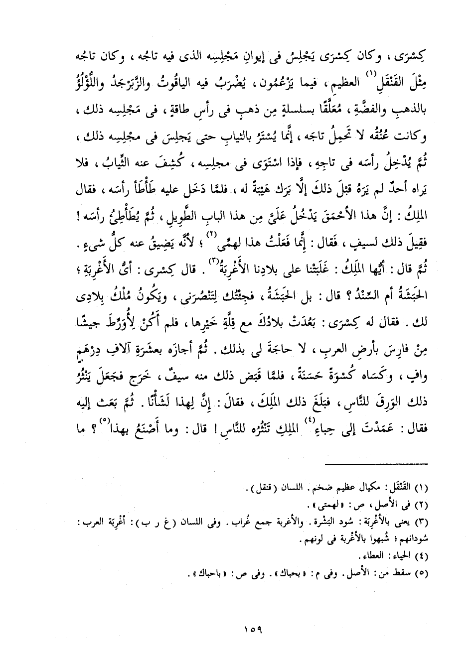 كِسْرَى وَكَانَ كِسْرَى يَجْلِسُ فِي إِيوَانِ مَجْلِسِهِ الَّذِي فِيهِ تَاجُهُ وَكَانَ تَاجُهُ مِثْلَ الْقُنْقُلِ الْعَظِيمِ فِيمَا يَزْعُمُونَ، يُضْرَبُ فِيهِ الْيَاقُوتُ وَالزَّبَرْجَدُ اللُّؤْلُؤُ بِالذَّهَبِ وَالْفِضَّةِ مُعَلَّقًا بِسِلْسِلَةٍ مِنْ ذَهَبٍ فِي رَأْسِ طَاقَةٍ فِي مَجْلِسِهِ ذَلِكَ، وَكَانَتْ عُنُقُهُ لَا تَحْمِلُ تَاجَهُ إِنَّمَا يَسْتُرُ عَلَيْهِ بِالثِّيَابِ حَتَّى يَجْلِسَ فِي مَجْلِسِهِ ذَلِكَ، ثُمَّ يُدْخِلُ رَأْسَهُ فِي تَاجِهِ فَاذَا اسْتَوَى فِي مَجْلِسِهِ كَشَفَ عَنْهُ الثِّيَابَ فَلَا يَرَاهُ أَحَدٌ لَمْ يَرَهُ قَبْلَ ذَلِكَ إِلَّا بَرَكَ هَيْبَةً لَهُ فَلَمَّا دَخَلَ عَلَيْهِ طَأْطَأَ رَأْسَهُ فَقَالَ الْمَلِكُ: إِنَّ هَذَا الْأَحْمَقَ يَدْخُلُ عَلَيَّ مِنْ هَذَا الْبَابِ الطَّوِيلِ، ثُمَّ يُطَأْطِئُ رَأْسَهُ فَقِيلَ ذَلِكَ لِسَيْفٍ فَقَالَ: إِنَّمَا فَعَلْتُ هَذَا لِهَمِّي لِأَنَّهُ يَضِيقُ عَنْهُ كُلُّ شَيْءٍ، ثُمَّ قَالَ: أَيُّهَا الْمَلِكُ غَلَبَتْنَا عَلَى بِلَادِنَا الْأَغْرِبَةُ. قَالَ كِسْرَى: أَيُّ الْأَغْرِبَةِ; الْحَبَشَةُ أَمِ السِّنَدُ؟ قَالَ: بَلِ الْحَبَشَةُ فَجِئْتُكَ لِتَنْصُرَنِي، وَيَكُونُ مُلْكُ بِلَادِي لَكَ. فَقَالَ لَهُ كِسْرَى: بَعُدَتْ بِلَادُكَ مَعَ قِلَّةِ خَيْرِهَا فَلَمْ أَكُنْ لِأُوَرِّطَ جَيْشًا مِنْ فَارِسَ بِأَرْضِ الْعَرَبِ لَا حَاجَةَ لِي بِذَلِكَ، ثُمَّ أَجَازَهُ بِعَشَرَةِ آلَافِ دِرْهَمٍ وَافٍ، وَكَسَاهُ كُسْوَةً حَسَنَةً فَلَمَّا قَبَضَ ذَلِكَ مِنْهُ سَيْفٌ خَرَجَ فَجَعَلَ يَنْثُرُ تِلْكَ الْوَرِقَ لِلنَّاسِ.