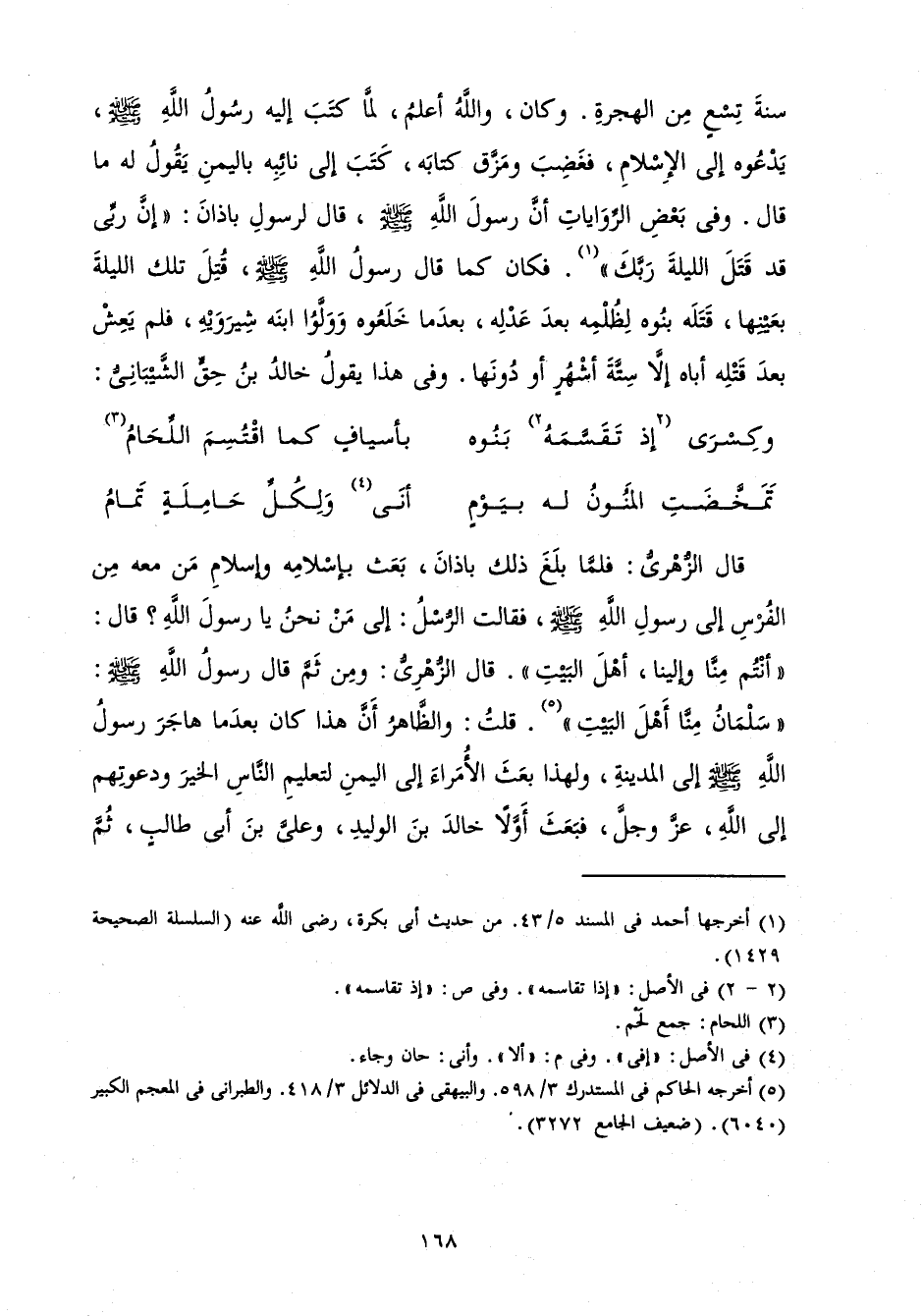 قَالَ الزُّهْرِيُّ: فَلَمَّا بَلَغَ ذَلِكَ بَاذَانَ بَعَثَ بِإِسْلَامِهِ، وَإِسْلَامِ مَنْ مَعَهُ مِنَ الْفُرْسِ إِلَى رَسُولِ اللَّهِ صَلَّى اللَّهُ عَلَيْهِ وَسَلَّمَ فَقَالَتِ الرُّسُلُ: إِلَى مَنْ نَحْنُ يَا رَسُولَ اللَّهِ؟ قَالَ «أَنْتُمْ مِنَّا، وَإِلَيْنَا أَهْلَ الْبَيْتِ» قَالَ الزُّهْرِيُّ: وَمِنْ ثَمَّ قَالَ رَسُولُ اللَّهِ صَلَّى اللَّهُ عَلَيْهِ وَسَلَّمَ: «سَلْمَانُ مِنَّا أَهْلَ الْبَيْتِ» قُلْتُ: وَالظَّاهِرُ أَنَّ هَذَا كَانَ بَعْدَ مَا هَاجَرَ رَسُولُ اللَّهِ صَلَّى اللَّهُ عَلَيْهِ وَسَلَّمَ إِلَى الْمَدِينَةِ، وَلِهَذَا بَعَثَ الْأُمَرَاءَ إِلَى الْيَمَنِ لِتَعْلِيمِ النَّاسِ الْخَيْرَ، وَدَعْوَتِهِمْ إِلَى اللَّهِ عَزَّ وَجَلَّ فَبَعَثَ أَوَّلًا خَالِدَ بْنَ الْوَلِيدِ، وَعَلِيَّ بْنَ أَبِي طَالِبٍ، ثُمَّ