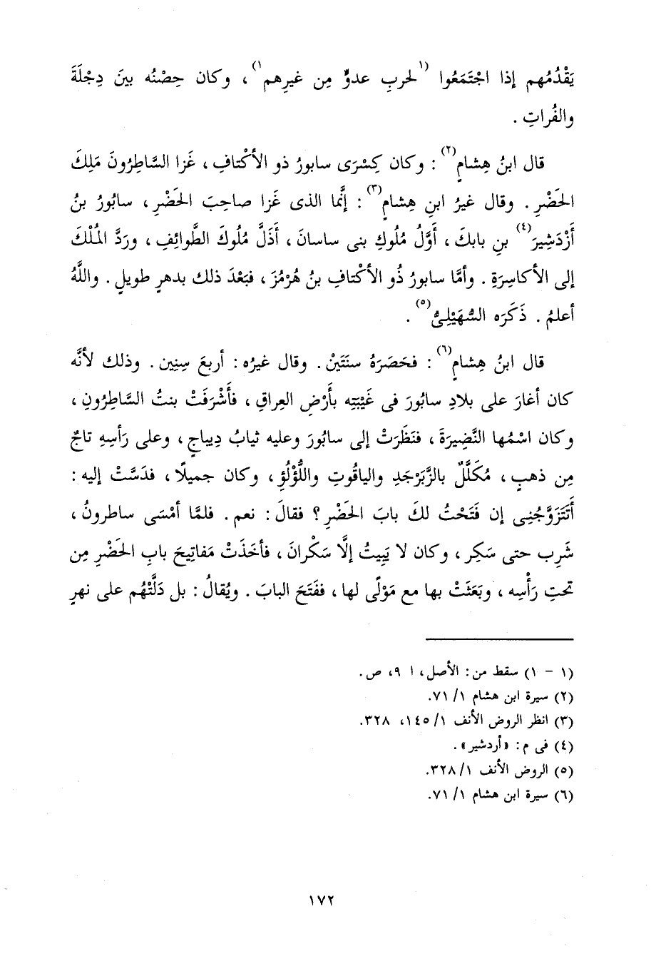قَالَ ابْنُ هِشَامٍ: وَكَانَ كِسْرَى سَابُورَ ذُو الْأَكْتَافِ غَزَا السَّاطِرُونَ مَلِكَ الْحَضْرِ، وَقَالَ غَيْرُ ابْنِ هِشَامٍ: إِنَّمَا الَّذِي غَزَا صَاحِبَ الْحَضْرِ ; سَابُورُ بْنُ أَزْدَشَيْرِ بْنِ بَابِكَ أَوَّلُ مُلُوكِ بَنِي سَاسَانَ أَذَلَّ مُلُوكَ الطَّوَائِفِ وَرَدَّ الْمُلْكَ إِلَى الْأَكَاسِرَةِ، وَأَمَّا سَابُورُ ذُو الْأَكْتَافِ بْنُ هُرْمُزَ فَبَعْدَ ذَلِكَ بِدَهْرٍ طَوِيلٍ. وَاللَّهُ أَعْلَمُ. ذَكَرَهُ السُّهَيْلِيُّ.