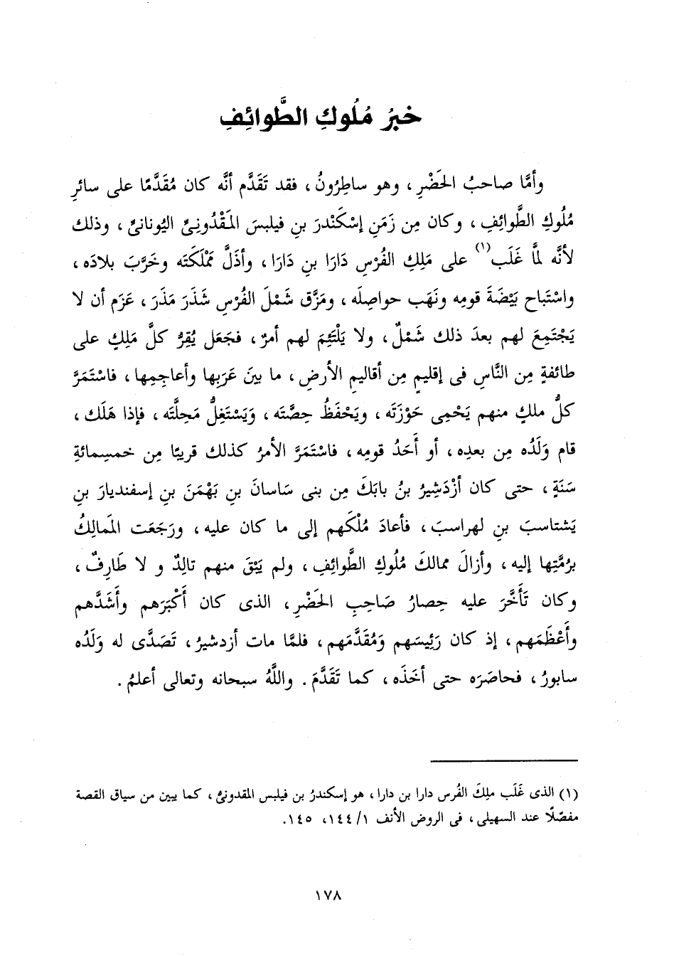 وَأَمَّا صَاحِبُ الْحَضْرِ وَهُوَ سَاطِرُونَ فَقَدْ تَقَدَّمَ أَنَّهُ كَانَ مُقَدَّمًا عَلَى سَائِرِ مُلُوكِ الطَّوَائِفِ وَكَانَ مِنْ زَمَنِ إِسْكَنْدَرَ بْنِ فِيلِبْسَ الْمَقْدُونِيِّ الْيُونَانِيِّ، وَذَلِكَ لِأَنَّهُ لَمَّا غَلَبَ عَلَى مَلِكِ الْفُرْسِ دَارَا بْنِ دَارَا وَأَذَلَّ مَمْلَكَتَهُ، وَخَرَّبَ بِلَادِهِ، وَاسْتَبَاحَ بَيْضَةَ قَوْمِهِ، وَنَهَبَ حَوَاصِلَهُ، وَمَزَّقَ شَمْلَ الْفُرْسِ شَذَرَ مَذَرَ، عَزَمَ أَنْ لَا يَجْتَمِعَ لَهُمْ بَعْدَ ذَلِكَ شَمْلٌ وَلَا يَلْتَئِمَ لَهُمْ أَمْرٌ فَجَعَلَ يُقِرُّ كُلَّ مَلِكٍ عَلَى طَائِفَةٍ مِنَ النَّاسِ فِي إِقْلِيمٍ مِنْ أَقَالِيمِ الْأَرْضِ، مَا بَيْنَ عَرَبِهَا وَأَعَاجِمِهَا فَاسْتَمَرَّ كُلُّ مَلِكٍ مِنْهُمْ يَحْمِي حَوْزَتَهُ وَيَحْفَظُ حِصَّتَهُ، وَيَسْتَغِلُّ مَحِلَّتَهُ فَاذَا هَلَكَ قَامَ وَلَدُهُ مِنْ بَعْدِهِ أَوْ أَحَدُ قَوْمِهِ فَاسْتَمَرَّ الْأَمْرُ كَذَلِكَ قَرِيبًا مِنْ خَمْسِمِائَةِ سَنَةٍ حَتَّى كَانَ أَزْدَشَيْرُ بْنُ بَابِكَ مِنْ بَنِي سَاسَانَ بْنِ بَهْمَنَ بْنِ إِسْفِنْدِيَارَ بْنِ يَشْتَاسِبَ بْنِ لِهْرَاسِبَ فَأَعَادَ مُلْكَهُمْ إِلَى مَا كَانَ عَلَيْهِ، وَرَجَعَتِ الْمَمَالِكُ بِرُمَّتِهَا إِلَيْهِ، وَأَزَالَ مَمَالِكَ مُلُوكِ الطَّوَائِفِ، وَلَمْ يَبْقَ مِنْهُمْ تَالِدٌ وَلَا طَارِفٌ وَكَانَ تَأَخَّرَ عَلَيْهِ حِصَارُ صَاحِبِ الْحَضْرِ الَّذِي كَانَ أَكْبَرَهُمْ وَأَشَدَّهُمْ وَأَعْظَمَهُمْ إِذْ كَانَ رَئِيسَهُمْ وَمُقَدَّمَهُمْ فَلَمَّا مَاتَ أَزْدَشَيْرُ تَصَدَّى لَهُ وَلَدُهُ سَابُورُ فَحَاصَرَهُ حَتَّى أَخَذَهُ كَمَا تَقَدَّمَ. وَاللَّهُ سُبْحَانَهُ وَتَعَالَى أَعْلَمُ.