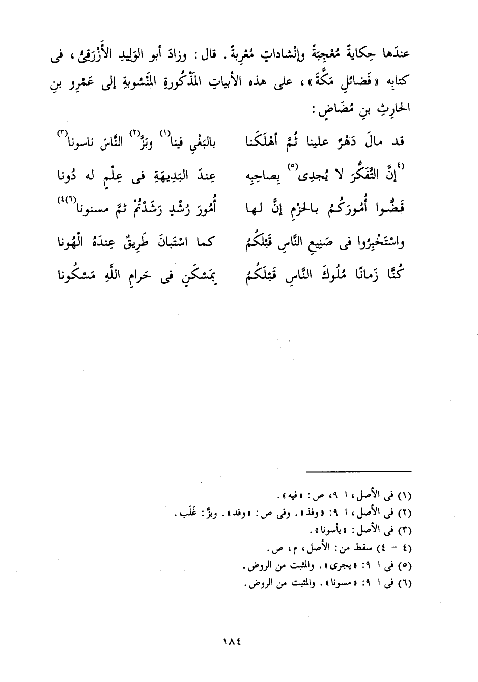 عِنْدَهَا حِكَايَةً مُعْجِبَةً، وَإِنْشَادَاتٍ مُعَرَّبَةً قَالَ: وَزَادَ أَبُو الْوَلِيدِ الْأَزْرَقِيُّ فِي كِتَابِهِ " فَضَائِلِ مَكَّةَ " عَلَى هَذِهِ الْأَبْيَاتِ الْمَذْكُورَةِ الْمَنْسُوبَةِ إِلَى عَمْرِو بْنِ الْحَارِثِ بْنِ مُضَاضٍ