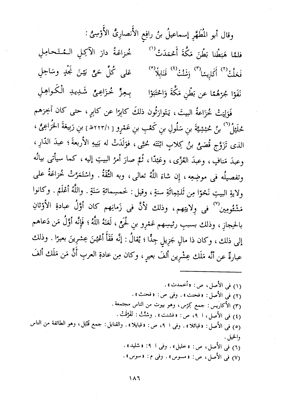 نَفَوْا جُرْهُمًا عَنْ بَطْنِ مَكَّةَ وَاحْتَبَوْا ... بِعِزٍّ خُزَاعِيٍّ شَدِيدِ الْكَوَاهِلِ