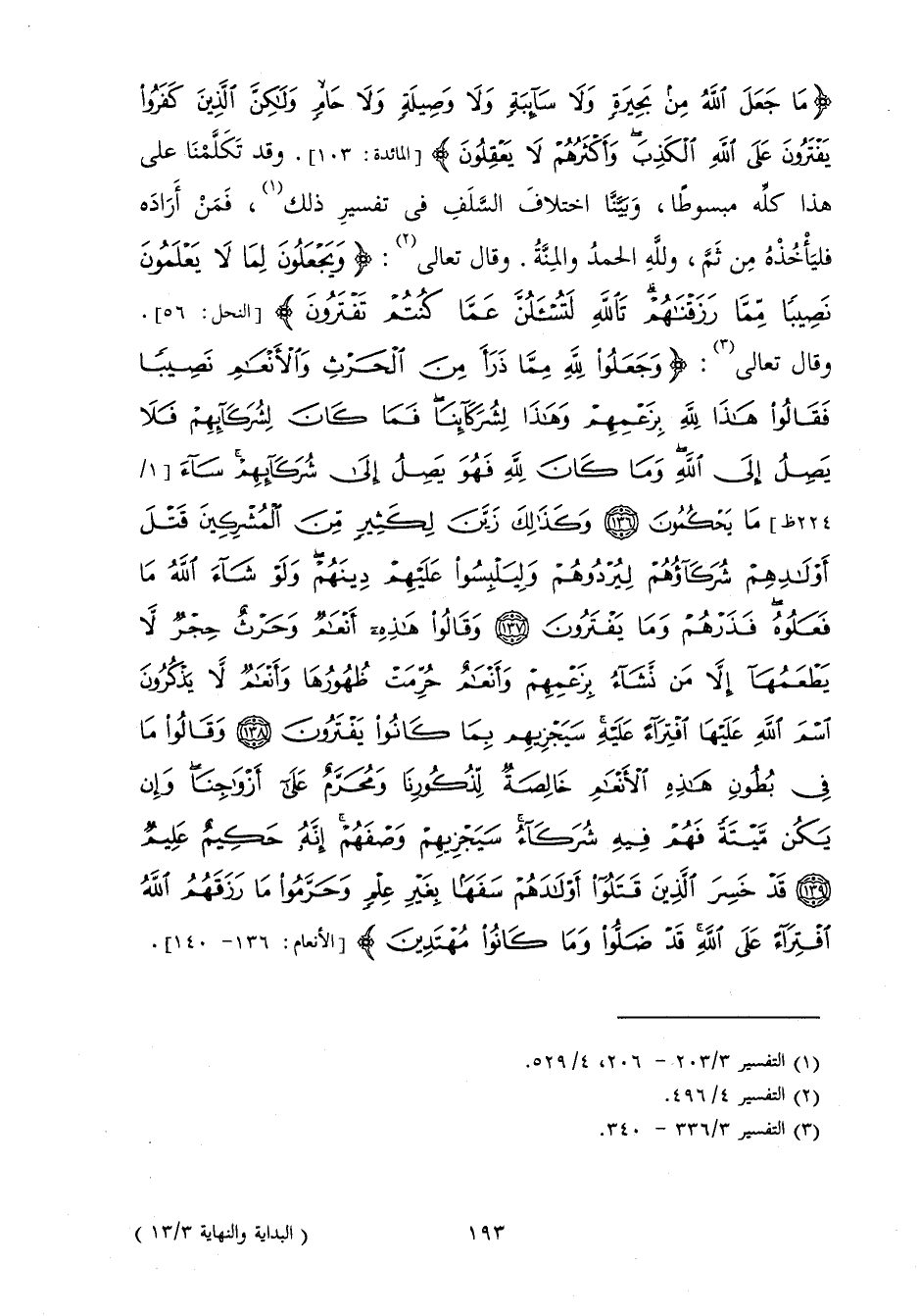 {مَا جَعَلَ اللَّهُ مِنْ بَحِيرَةٍ وَلَا سَائِبَةٍ وَلَا وَصِيلَةٍ وَلَا حَامٍ وَلَكِنَّ الَّذِينَ كَفَرُوا يَفْتَرُونَ عَلَى اللَّهِ الْكَذِبَ وَأَكْثَرُهُمْ لَا يَعْقِلُونَ} [المائدة: 103] وَقَدْ تَكَلَّمْنَا عَلَى هَذَا كُلِّهِ مَبْسُوطًا، وَبَيَّنَّا اخْتِلَافَ السَّلَفِ فِي تَفْسِيرِ ذَلِكَ فَمَنْ أَرَادَ فَلْيَأْخُذْهُ مِنْ ثَمَّ وَلِلَّهِ الْحَمْدُ وَالْمِنَّةُ.