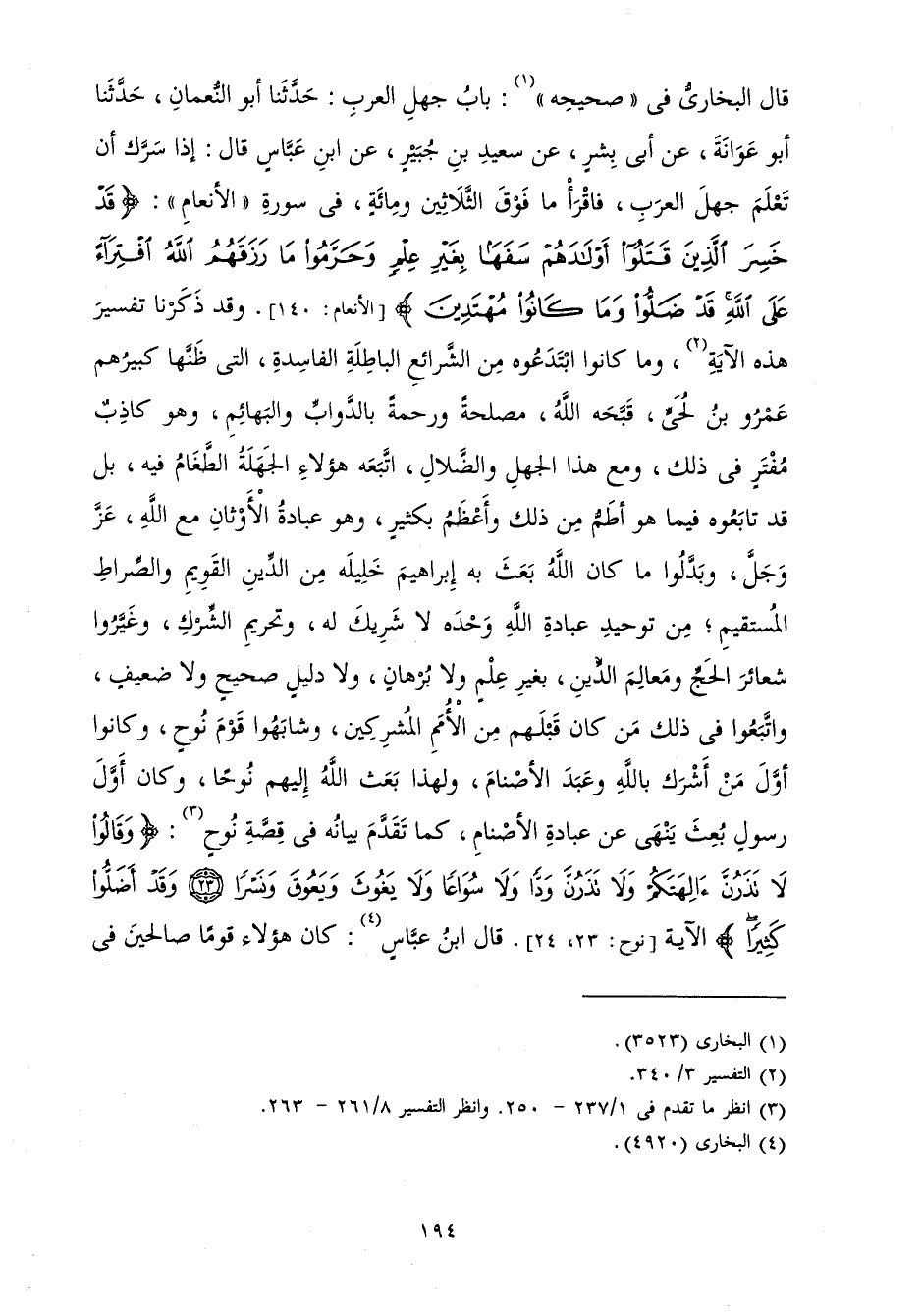 قَالَ الْبُخَارِيُّ فِي صَحِيحِهِ: بَابُ جَهْلِ الْعَرَبِ: حَدَّثَنَا أَبُو النُّعْمَانِ حَدَّثَنَا أَبُو عَوَانَةَ عَنْ أَبِي بِشْرٍ عَنْ سَعِيدِ بْنِ جُبَيْرٍ عَنِ ابْنِ عَبَّاسٍ قَالَ: إِذَا سَرَّكَ أَنْ تَعْلَمَ جَهْلَ الْعَرَبِ فَاقْرَأْ مَا فَوْقَ الثَّلَاثِينَ وَمِائَةٍ فِي سُورَةِ الْأَنْعَامِ {قَدْ خَسِرَ الَّذِينَ قَتَلُوا أَوْلَادَهُمْ سَفَهًا بِغَيْرِ عِلْمٍ وَحَرَّمُوا مَا رَزَقَهُمُ اللَّهُ افْتِرَاءً عَلَى اللَّهِ قَدْ ضَلُّوا وَمَا كَانُوا مُهْتَدِينَ} [الأنعام: 140] وَقَدْ ذَكَرْنَا تَفْسِيرَ هَذِهِ الْآيَةِ وَمَا كَانُوا ابْتَدَعُوهُ مِنَ الشَّرَائِعِ الْبَاطِلَةِ الْفَاسِدَةِ الَّتِي ظَنَّهَا كَبِيرُهُمْ عَمْرُو بْنُ لُحَيٍّ - قَبَّحَهُ اللَّهُ - مَصْلَحَةً وَرَحْمَةً بِالدَّوَابِّ وَالْبَهَائِمِ وَهُوَ كَاذِبٌ مُفْتَرٍ فِي ذَلِكَ، وَمَعَ هَذَا الْجَهْلِ وَالضَّلَالِ اتَّبَعَهُ هَؤُلَاءِ الْجَهَلَةُ الطَّغَامُ فِيهِ بَلْ قَدْ تَابَعُوهُ فِيمَا هُوَ أَطَمُّ مِنْ ذَلِكَ وَأَعْظَمُ بِكَثِيرٍ وَهُوَ عِبَادَةُ الْأَوْثَانِ مَعَ اللَّهِ عَزَّ وَجَلَّ، وَبَدَّلُوا مَا كَانَ اللَّهُ بَعَثَ بِهِ ابْرَاهِيمَ خَلِيلَهُ مِنَ الدِّينِ الْقَوِيمِ وَالصِّرَاطِ الْمُسْتَقِيمِ مِنْ تَوْحِيدِ عِبَادَةِ اللَّهِ وَحْدَهُ لَا شَرِيكَ لَهُ، وَتَحْرِيمِ الشِّرْكِ، وَغَيَّرُوا شَعَائِرَ الْحَجِّ، وَمَعَالِمَ الدِّينِ بِغَيْرِ عِلْمٍ وَلَا بُرْهَانٍ وَلَا دَلِيلٍ صَحِيحٍ وَلَا ضَعِيفٍ، وَاتَّبَعُوا فِي ذَلِكَ مَنْ كَانَ قَبْلَهُمْ مِنَ الْأُمَمِ الْمُشْرِكِينَ، وَشَابَهُوا قَوْمَ نُوحٍ كَانُوا أَوَّلَ مَنْ أَشْرَكَ بِاللَّهِ، وَعَبَدَ الْأَصْنَامَ، وَلِهَذَا بَعَثَ اللَّهُ إِلَيْهِمْ نُوحًا وَكَانَ أَوَّلَ رَسُولٍ بُعِثَ يَنْهَى عَنْ عِبَادَةِ الْأَصْنَامِ كَمَا تَقَدَّمَ بَيَانُهُ فِي قِصَّةِ نُوحٍ {وَقَالُوا لَا تَذَرُنَّ آلِهَتَكُمْ وَلَا تَذَرُنَّ وَدًّا وَلَا سُوَاعًا وَلَا يَغُوثَ وَيَعُوقَ وَنَسْرًا وَقَدْ أَضَلُّوا كَثِيرًا} [نوح: 23]