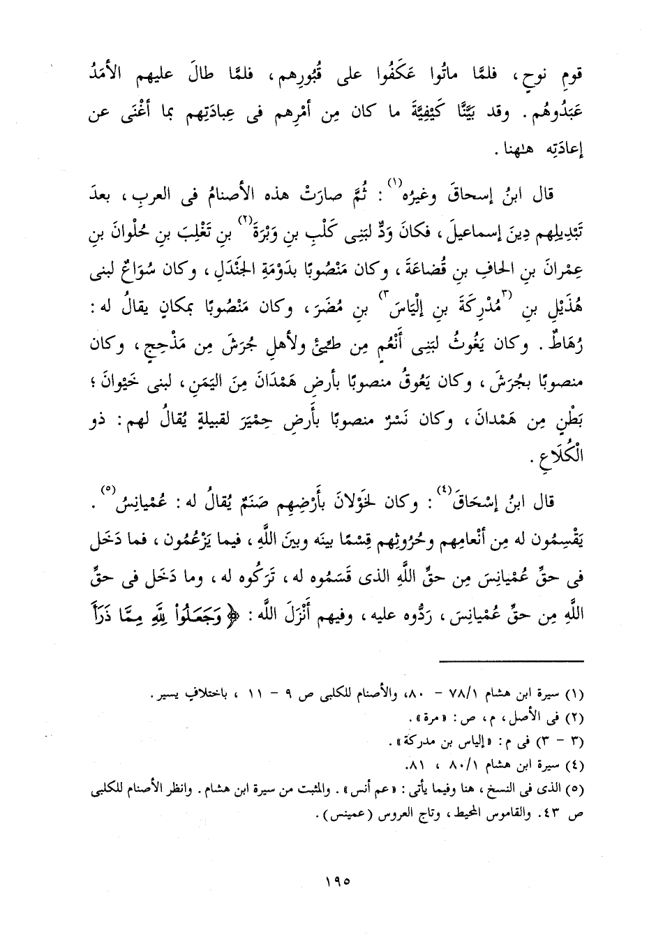 قَالَ ابْنُ إِسْحَاقَ وَغَيْرُهُ: ثُمَّ صَارَتْ هَذِهِ الْأَصْنَامُ فِي الْعَرَبِ بَعْدَ تَبْدِيلِهِمْ دِينَ إِسْمَاعِيلَ فَكَانَ وَدُّ لِبَنِي كَلْبِ بْنِ وَبْرَةَ بْنِ تَغَلِبَ بْنِ حُلْوَانَ بْنِ عِمْرَانَ بْنِ الْحَافِ بْنِ قُضَاعَةَ وَكَانَ مَنْصُوبًا بِدَوْمَةِ الْجَنْدَلِ وَكَانَ سُوَاعٌ لِبَنِي هُذَيْلِ بْنِ مُدْرِكَةَ بْنِ إِلْيَاسَ بْنِ مُضَرَ وَكَانَ مَنْصُوبًا بِمَكَانٍ يُقَالَ لَهُ: رُهَاطٌ. وَكَانَ يَغُوثُ لِبَنِي أَنْعَمَ مِنْ طَيِّئٍ، وَلِأَهْلِ جُرَشٍ مِنْ مَذْحِجٍ وَكَانَ مَنْصُوبًا بِجُرَشَ وَكَانَ يَعُوقُ مَنْصُوبًا بِأَرْضِ هَمْدَانَ مِنَ الْيَمَنِ لِبَنِي خَيْوَانَ بَطْنٍ مِنْ هَمَدَانَ وَكَانَ نَسْرٌ مَنْصُوبًا بِأَرْضِ حِمْيَرَ لِقَبِيلَةٍ يُقَالَ لَهُمْ ذُو الْكُلَاعِ.