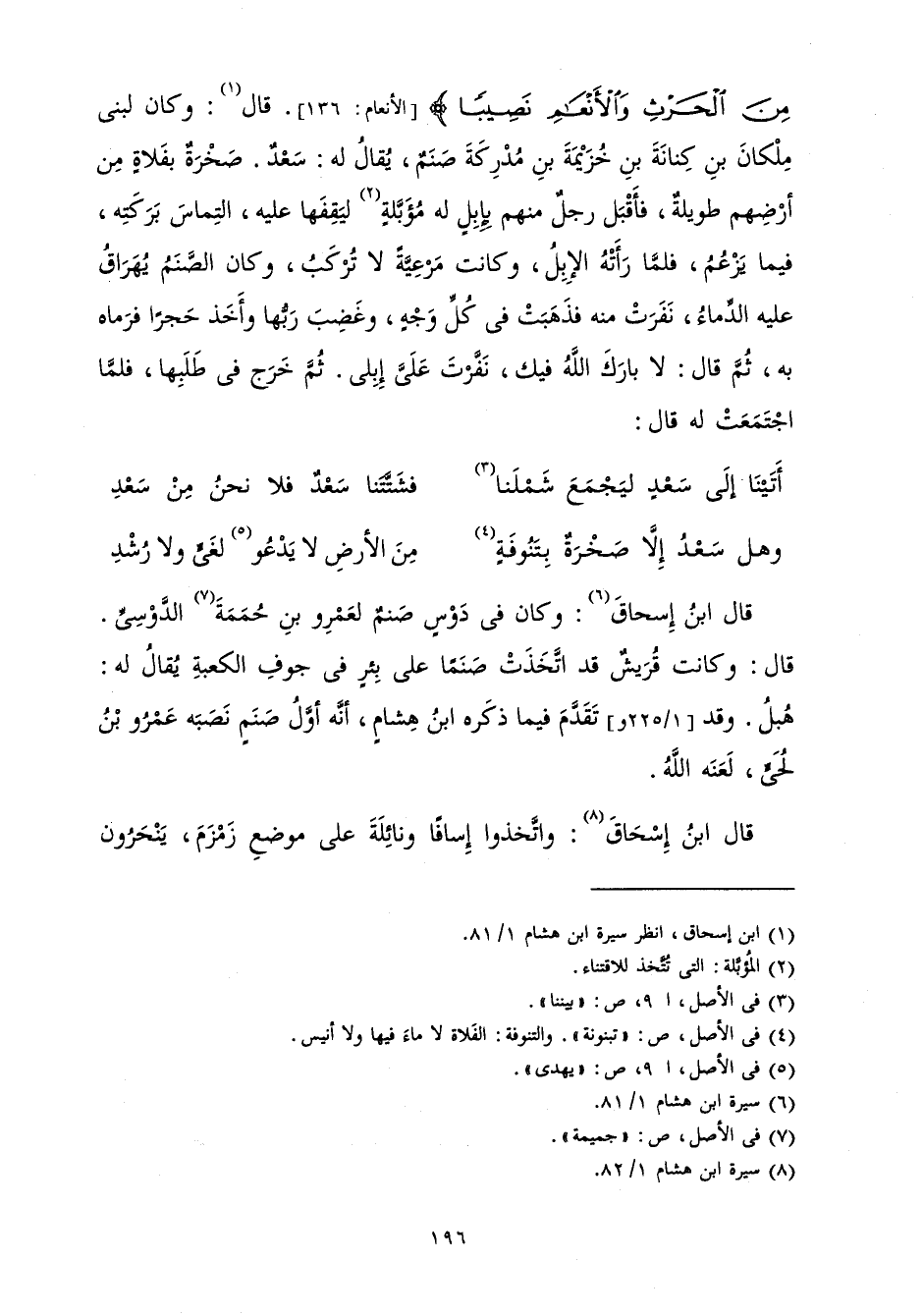 قَالَ: وَكَانَ لِبَنِي مِلْكَانَ بْنِ كِنَانَةَ بْنِ خُزَيْمَةَ بْنِ مُدْرِكَةَ صَنَمٌ يُقَالَ لَهُ: سَعْدٌ، صَخْرَةٌ بِفَلَاةٍ مِنْ أَرْضِهِمْ طَوِيلَةٍ فَأَقْبَلَ رَجُلٌ مِنْهُمْ بِإِبِلٍ لَهُ مُؤَبَّلَةٍ لِيَقِفَهَا عَلَيْهِ الْتِمَاسَ بَرَكَتِهِ فِيمَا يَزْعُمُ فَلَمَّا رَأَتْهُ الْإِبِلُ وَكَانَتْ مَرْعِيَّةً لَا تُرْكَبُ وَكَانَ الصَّنَمُ يُهْرَاقُ عَلَيْهِ الدِّمَاءُ نَفَرَتْ مِنْهُ فَذَهَبَتْ فِي كُلِّ وَجْهٍ، وَغَضِبَ رَبُّهَا وَأَخَذَ حَجَرًا فَرَمَاهُ بِهِ، ثُمَّ قَالَ: لَا بَارَكَ اللَّهُ فِيكَ نَفَرْتَ عَلَيَّ إِبِلِي، ثُمَّ خَرَجَ فِي طَلَبِهَا فَلَمَّا اجْتَمَعَتْ لَهُ قَالَ: