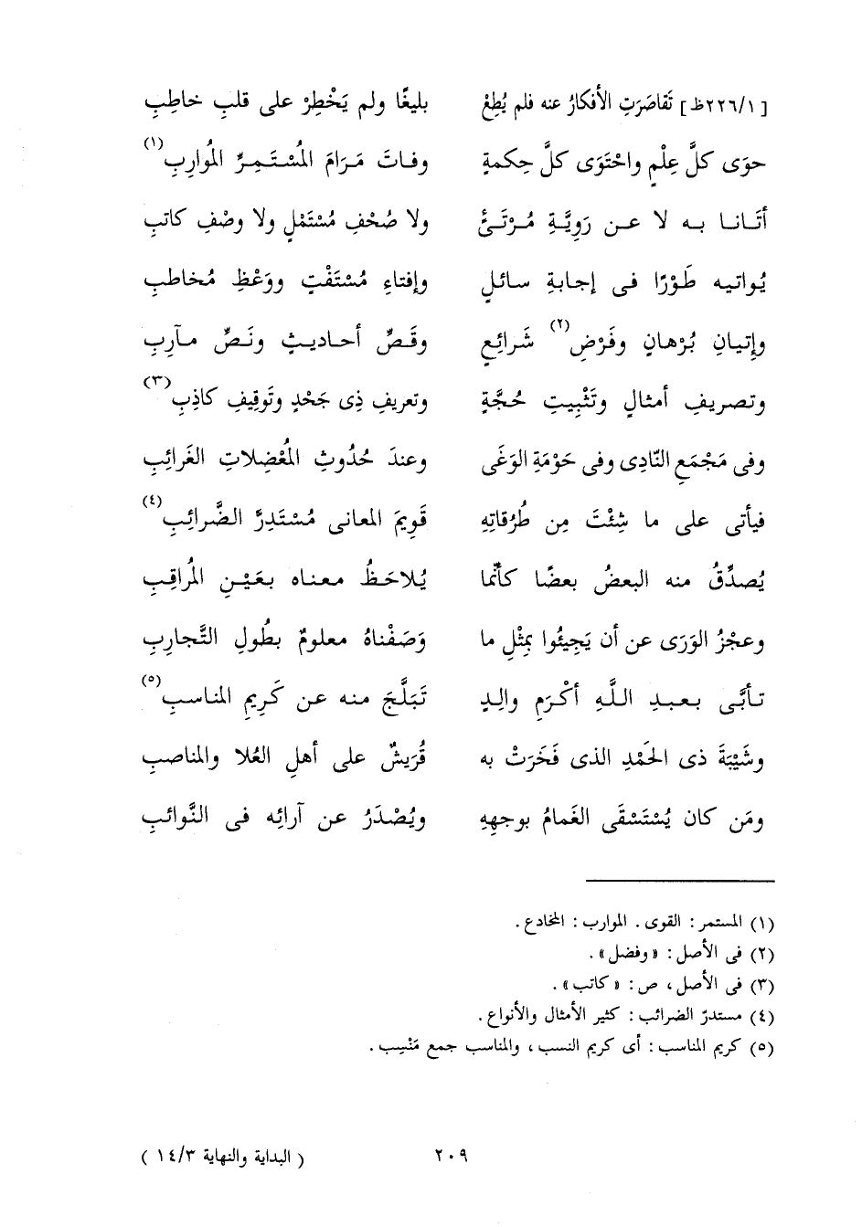 حَوَى كُلَّ عِلْمٍ وَاحْتَوَى كُلَّ حِكْمَةٍ ... وَفَاتَ مَرَامَ الْمُسْتَمِرِّ الْمُوَارِبِ