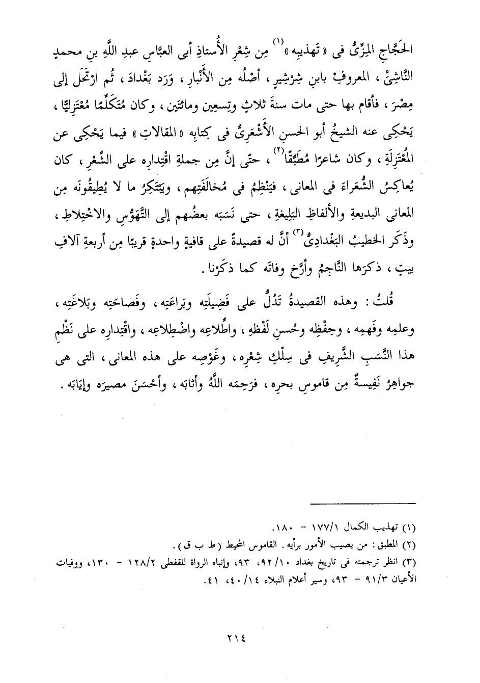 أَبُو الْحَجَّاجِ الْمِزِّيُّ فِي تَهْذِيبِهِ مِنْ شِعْرِ الْأُسْتَاذِ أَبِي الْعَبَّاسِ عَبْدِ اللَّهِ بْنِ مُحَمَّدٍ النَّاشِئِ الْمَعْرُوفِ بِابْنِ شِرْشِيرٍ، أَصْلُهُ مِنَ الْأَنْبَارِ وَرَدَ بَغْدَادَ، ثُمَّ ارْتَحَلَ إِلَى مِصْرَ فَأَقَامَ بِهَا حَتَّى مَاتَ سَنَةَ ثَلَاثٍ وَتِسْعِينَ وَمِائَتَيْنِ. وَكَانَ مُتَكَلِّمًا مُعْتَزِلِيًّا يَحْكِي عَنْهُ الشَّيْخُ أَبُو الْحَسَنِ الْأَشْعَرِيُّ فِي كِتَابِهِ الْمَقَالَاتِ فِيمَا يَحْكِي عَنِ الْمُعْتَزِلَةِ وَكَانَ شَاعِرًا مُطَبِّقًا حَتَّى أَنَّ مِنْ جُمْلَةِ اقْتِدَارِهِ عَلَى الشِّعْرِ كَانَ يُعَاكِسُ الشُّعَرَاءَ فِي الْمَعَانِي فَيَنْظِمُ فِي مُخَالَفَتِهِمْ، وَيَبْتَكِرُ مَا لَا يُطِيقُونَهُ مِنَ الْمَعَانِي الْبَدِيعَةِ وَالْأَلْفَاظِ الْبَلِيغَةِ حَتَّى نَسَبَهُ بَعْضُهُمْ إِلَى التَّهَوُّسِ وَالِاخْتِلَاطِ. وَذَكَرَ الْخَطِيبُ الْبَغْدَادِيُّ أَنَّ لَهُ قَصِيدَةً عَلَى قَافِيَةٍ وَاحِدَةٍ قَرِيبًا مِنْ أَرْبَعَةِ آلَافِ بَيْتٍ ذَكَرَهَا النَّاجِمُ وَأَرَّخَ وَفَاتَهُ كَمَا ذَكَرْنَا.