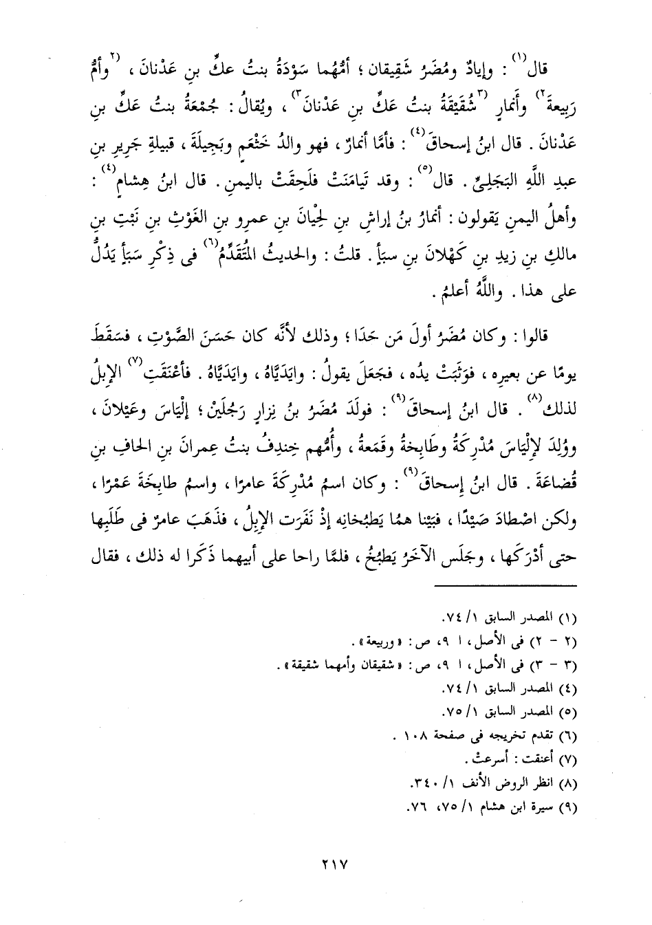 قَالَ: وَإِيَادُ وَمُضَرُ شَقِيقَانِ أُمُّهُمَا سَوْدَةُ بِنْتُ عَكِّ بْنِ عَدْنَانَ، وَأُمُّ رَبِيعَةَ وَأَنْمَارٍ شُقَيْقَةُ بِنْتُ عَكِّ بْنِ عَدْنَانَ، وَيُقَالُ: جُمْعَةُ بِنْتُ عَكِّ بْنِ عَدْنَانَ قَالَ ابْنُ إِسْحَاقَ: فَأَمَّا أَنْمَارٌ فَهُوَ وَالِدُ خَثْعَمٍ وَبَجِيلَةَ قَبِيلَةِ جَرِيرِ بْنِ عَبْدِ اللَّهِ الْبَجَلِيِّ قَالَ: وَقَدْ تَيَامَنَتْ فَلَحِقَتْ بِالْيَمَنِ قَالَ ابْنُ هِشَامٍ: وَأَهْلُ الْيَمَنِ يَقُولُونَ أَنْمَارُ بْنُ أَرَاشِ بْنِ لَحْيَانَ بْنِ عَمْرِو بْنِ الْغَوْثِ بْنِ نَبْتِ بْنِ مَالِكِ بْنِ زَيْدِ بْنِ كَهْلَانَ بْنِ سَبَأٍ قُلْتُ: وَالْحَدِيثُ الْمُتَقَدِّمُ فِي ذِكْرِ سَبَأٍ يَدُلُّ عَلَى هَذَا. وَاللَّهُ أَعْلَمُ.