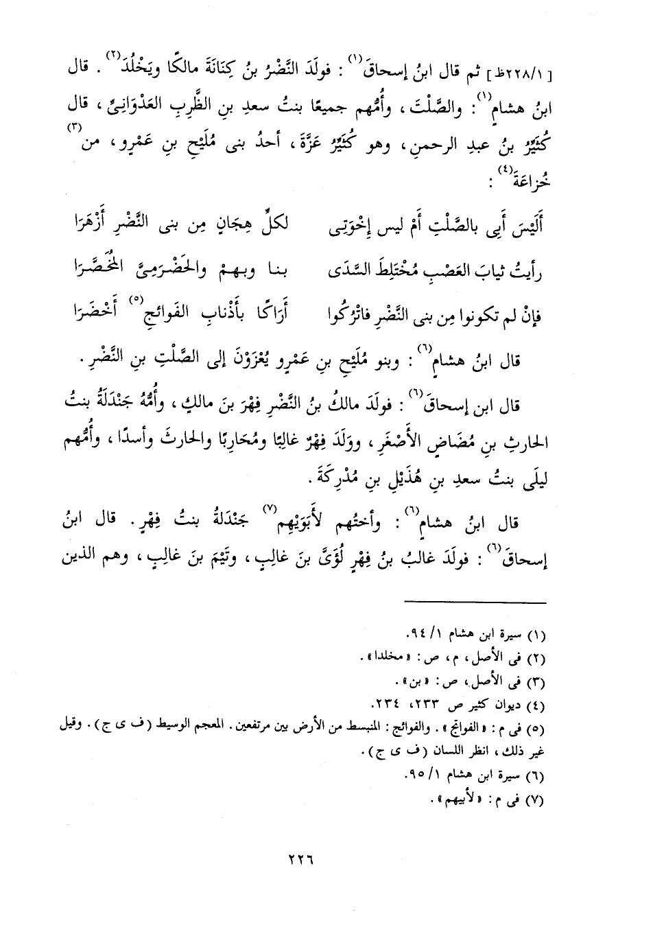 ثُمَّ قَالَ ابْنُ إِسْحَاقَ: فَوَلَدَ النَّضْرُ بْنُ كِنَانَةَ مَالِكًا وَيَخْلُدَ. قَالَ ابْنُ هِشَامٍ: وَالصَّلْتَ، وَأُمُّهُمْ جَمِيعًا بِنْتُ سَعْدِ بْنِ الظَّرِبِ الْعَدْوَانِيِّ قَالَ كُثَيِّرُ بْنُ عَبْدِ الرَّحْمَنِ وَهُوَ كُثَيِّرُ عَزَّةَ أَحَدُ بَنِي مُلَيْحِ بْنِ عَمْرٍو مِنْ خُزَاعَةَ: