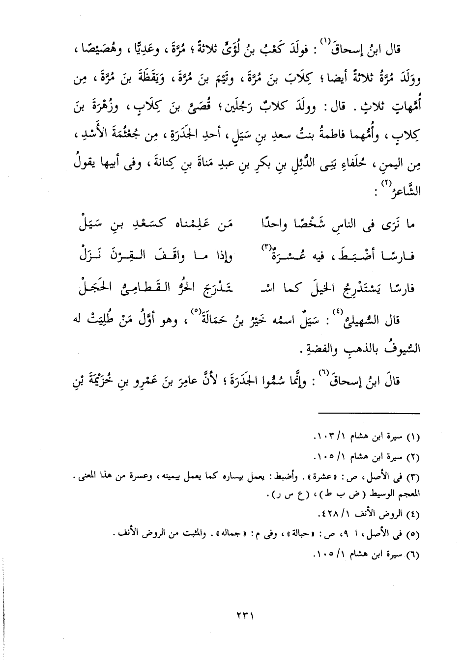 قَالَ ابْنُ إِسْحَاقَ: فَوَلَدَ كَعْبُ بْنُ لُؤَيٍّ ثَلَاثَةً ; مُرَّةَ وَعَدِيًّا وَهُصَيْصًا، وَوَلَدَ مُرَّةُ ثَلَاثَةً أَيْضًا; كِلَابَ بْنَ مُرَّةَ وَتَيْمَ بْنَ مُرَّةَ وَيَقَظَةَ بْنَ مُرَّةَ، مِنْ أُمَّهَاتٍ ثَلَاثٍ قَالَ: وَوَلَدَ كِلَابٌ رَجُلَيْنِ قُصَيَّ بْنَ كِلَابٍ وَزُهْرَةَ بْنَ كِلَابٍ، وَأُمُّهُمَا فَاطِمَةُ بِنْتُ سَعْدِ بْنِ سَيَلٍ أَحَدِ الْجَدَرَةِ مِنْ جُعْثُمَةَ الْأَسَدِ مِنَ الْيَمَنِ حُلَفَاءِ بَنِي الدُّئِلِ بْنِ بَكْرِ بْنِ عَبْدِ مَنَاةَ بْنِ كِنَانَةَ، وَفِي أَبِيهَا يَقُولُ الشَّاعِرُ