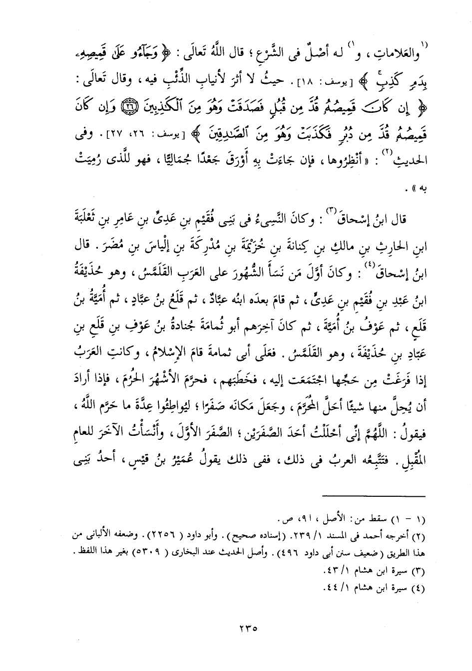 وَالْعَلَامَاتِ، وَلَهُ أَصْلٌ فِي الشَّرْعِ، قَالَ اللَّهُ تَعَالَى {وَجَاءُوا عَلَى قَمِيصِهِ بِدَمٍ كَذِبٍ} [يوسف: 18] حَيْثُ لَا أَثَرَ لِأَنْيَابِ الذِّئْبِ فِيهِ، وَقَالَ تَعَالَى {إِنْ كَانَ قَمِيصُهُ قُدَّ مِنْ قُبُلٍ فَصَدَقَتْ وَهُوَ مِنَ الْكَاذِبِينَ وَإِنْ كَانَ قَمِيصُهُ قُدَّ مِنْ دُبُرٍ فَكَذَبَتْ وَهُوَ مِنَ الصَّادِقِينَ} [يوسف: 26] وَفِي الْحَدِيثِ «أَنِظْرُوهَا فَإِنْ جَاءَتْ بِهِ أَوْرَقَ جَعْدًا جُمَالِيًّا فَهُوَ الَّذِي رُمِيَتْ بِهِ» قَالَ ابْنُ إِسْحَاقَ: وَكَانَ النَّسِيءُ فِي بَنِي فُقَيْمِ بْنِ عَدِيِّ بْنِ عَامِرِ بْنِ ثَعْلَبَةَ بْنِ الْحَارِثِ بْنِ مَالِكِ بْنِ كِنَانَةَ بْنِ خُزَيْمَةَ بْنِ مُدْرِكَةَ بْنِ إِلْيَاسَ بْنِ مُضَرَ. قَالَ ابْنُ إِسْحَاقَ: وَكَانَ أَوَّلُ مَنْ نَسَأَ الشُّهُورَ عَلَى الْعَرَبِ الْقَلَمَّسُ، وَهُوَ حُذَيْفَةُ بْنُ عَبْدِ بْنِ فُقَيْمِ بْنِ عَدِيٍّ، ثُمَّ قَامَ بَعْدَهُ ابْنُهُ عَبَّادٌ، ثُمَّ قَلَعُ بْنُ عَبَّادٍ، ثُمَّ أُمَيَّةُ بْنُ قَلَعٍ، ثُمَّ عَوْفُ بْنُ أُمَيَّةَ، ثُمَّ كَانَ آخِرَهُمْ أَبُو ثُمَامَةَ جُنَادَةُ بْنُ عَوْفِ بْنِ قَلَعِ بْنِ عَبَّادِ بْنِ حُذَيْفَةَ وَهُوَ الْقَلَمَّسُ فَعَلَى أَبِي ثُمَامَةَ قَامَ الْإِسْلَامُ. وَكَانَتِ الْعَرَبُ إِذَا فَرَغَتْ مِنْ حَجِّهَا اجْتَمَعَتْ إِلَيْهِ فَخَطَبَهُمْ فَحَرَّمَ الْأَشْهُرَ الْحُرُمَ فَإِذَا أَرَادَ أَنْ يُحِلَّ مِنْهَا شَيْئًا أَحَلَّ الْمُحَرَّمَ، وَجَعَلَ مَكَانَهُ صَفَرًا ; لِيُوَاطِئُوا عِدَّةَ مَا حَرَّمَ اللَّهُ فَيَقُولُ: اللَّهُمَّ إِنِّي أَحْلَلْتُ أَحَدَ الصَّفَرَيْنِ الصَّفَرَ الْأَوَّلَ، وَأَنْسَأْتُ الْآخَرَ لِلْعَامِ الْمُقْبِلِ فَتَتَّبِعُهُ الْعَرَبُ فِي ذَلِكَ فَفِي ذَلِكَ يَقُولُ عُمَيْرُ بْنُ قَيْسٍ أَحَدُ بَنِي