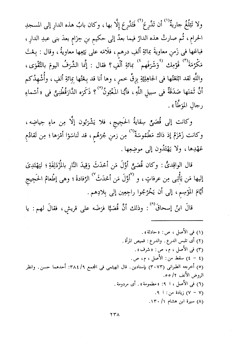 وَلَا تَبْلُغُ جَارِيَةٌ أَنْ تَدَّرِعَ فَتَدَّرِعَ إِلَّا بِهَا وَكَانَ بَابُ هَذِهِ الدَّارِ إِلَى الْمَسْجِدِ الْحَرَامِ، ثُمَّ صَارَتْ هَذِهِ الدَّارُ فِيمَا بَعْدُ، إِلَى حَكِيمِ بْنِ حِزَامٍ بَعْدَ بَنِي عَبْدِ الدَّارِ فَبَاعَهَا فِي زَمَنِ مُعَاوِيَةَ بِمِائَةِ أَلْفِ دِرْهَمٍ فَلَامَهُ عَلَى بَيْعِهَا مُعَاوِيَةُ، وَقَالَ: بِعْتَ مَكْرُمَةَ قَوْمِكَ، وَشَرَفَهُمْ بِمِائَةِ أَلْفٍ؟ فَقَالَ: إِنَّمَا الشَّرَفُ الْيَوْمَ بِالتَّقْوَى وَاللَّهِ لَقَدِ ابْتَعْتُهَا فِي الْجَاهِلِيَّةِ بِزِقِّ خَمْرٍ، وَهَا أَنَا قَدْ بِعْتُهَا بِمِائَةِ أَلْفٍ، وَأُشْهِدُكُمْ أَنَّ ثَمَنَهَا صَدَقَةٌ فِي سَبِيلِ اللَّهِ فَأَيُّنَا الْمَغْبُونُ؟ ذَكَرَهُ الدَّارَقُطْنِيُّ فِي أَسْمَاءِ رِجَالِ الْمُوَطَّأِ.