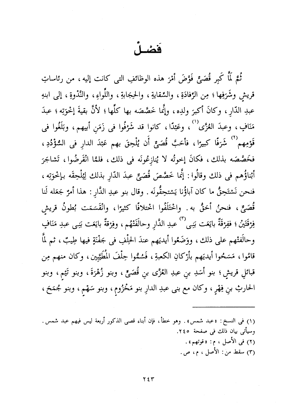 ثُمَّ لَمَّا كَبِرَ قُصَيٌّ فَوَّضَ أَمْرَ هَذِهِ الْوَظَائِفِ الَّتِي كَانَتْ إِلَيْهِ مِنْ رِئَاسَاتِ قُرَيْشٍ وَشَرَفِهَا، مِنَ الرِّفَادَةِ وَالسِّقَايَةِ وَالْحِجَابَةِ وَاللِّوَاءِ وَالنَّدْوَةِ إِلَى ابْنِهِ عَبْدِ الدَّارِ وَكَانَ أَكْبَرَ وَلَدِهِ، وَإِنَّمَا خَصَّصَهُ بِهَا كُلِّهَا; لِأَنَّ بَقِيَّةَ إِخْوَتِهِ عَبْدَ مَنَافٍ وَعَبْدَ الْعُزَّى وَعَبْدًا، كَانُوا قَدْ شَرُفُوا فِي زَمَنِ أَبِيهِمْ، وَبَلَغُوا فِي قُوَّتِهِمْ شَرَفًا كَبِيرًا فَأَحَبَّ قُصَيٌّ أَنْ يُلْحِقَ بِهِمْ عَبْدَ الدَّارِ فِي السُّؤْدُدِ فَخَصَّصَهُ بِذَلِكَ فَكَانَ إِخْوَتُهُ لَا يُنَازِعُونَهُ فِي ذَلِكَ فَلَمَّا انْقَرَضُوا تَشَاجَرَ ابْنَاؤُهُمْ فِي ذَلِكَ، وَقَالُوا: إِنَّمَا خَصَّصَ قُصَيٌّ عَبْدَ الدَّارِ بِذَلِكَ; لِيُلْحِقَهُ بِإِخْوَتِهِ فَنَحْنُ نَسْتَحِقُّ مَا كَانَ آبَاؤُنَا يَسْتَحِقُّونَهُ. وَقَالَ بَنُو عَبْدِ الدَّارِ: هَذَا أَمْرٌ جَعَلَهُ لَنَا قُصَيٌّ فَنَحْنُ أَحَقُّ بِهِ، وَاخْتَلَفُوا اخْتِلَافًا كَثِيرًا. وَانْقَسَمَتْ بُطُونُ قُرَيْشٍ فِرْقَتَيْنِ فَفِرْقَةٌ بَايَعَتْ بَنِي عَبْدِ الدَّارِ وَحَالَفَتْهُمْ، وَفِرْقَةٌ بَايَعَتْ بَنِي عَبْدِ مَنَافٍ وَحَالَفَتْهُمْ عَلَى ذَلِكَ، وَوَضَعُوا أَيْدِيَهُمْ عِنْدَ الْحِلْفِ فِي جَفْنَةٍ فِيهَا طِيبٌ، ثُمَّ لَمَّا قَامُوا مَسَحُوا أَيْدِيَهُمْ بِأَرْكَانِ الْكَعْبَةِ فَسُمُّوا حِلْفَ الْمُطَيَّبِينَ وَكَانَ مِنْهُمْ مَنْ قَبَائِلِ قُرَيْشٍ، بَنُو أَسَدِ بْنِ عَبْدِ الْعُزَّى بْنِ قُصَيٍّ، وَبَنُو زُهْرَةَ، وَبَنُو تَيْمٍ، وَبَنُو الْحَارِثِ بْنِ فِهْرٍ وَكَانَ مَعَ بَنِي عَبْدِ الدَّارِ، بَنُو مَخْزُومٍ، وَبَنُو سَهْمٍ، وَبَنُو جُمَحَ،