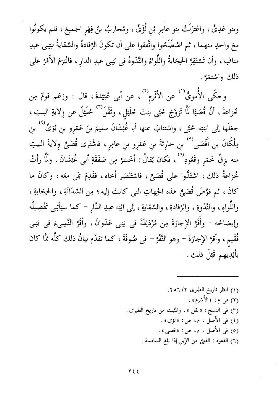 وَبَنُو عَدِيٍّ، وَاعْتَزَلَتْ بَنُو عَامِرِ بْنِ لُؤَيٍّ، وَمُحَارِبُ بْنُ فِهْرٍ الْجَمِيعَ فَلَمْ يَكُونُوا مَعَ وَاحِدٍ مِنْهُمَا، ثُمَّ اصْطَلَحُوا وَاتَّفَقُوا عَلَى أَنْ تَكُونَ الرِّفَادَةُ وَالسِّقَايَةُ لِبَنِي عَبْدِ مَنَافٍ، وَأَنْ تَسْتَقِرَّ الْحِجَابَةُ وَاللِّوَاءُ وَالنَّدْوَةُ فِي بَنِي عَبْدِ الدَّارِ فَانْبَرَمَ الْأَمْرُ عَلَى ذَلِكَ وَاسْتَمَرَّ.