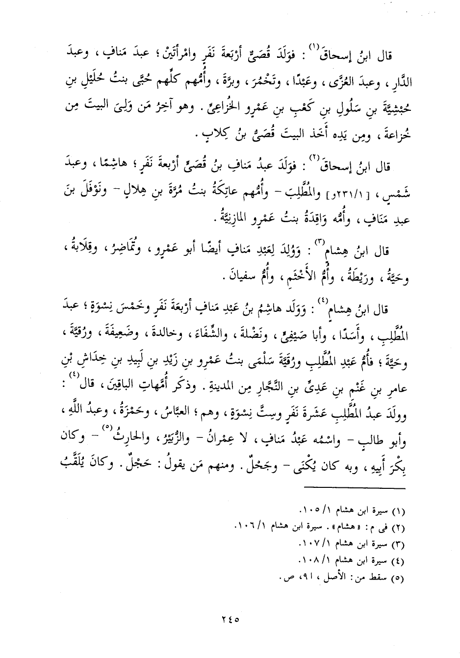 قَالَ ابْنُ هِشَامٍ: وَوُلِدَ لِعَبْدِ مَنَافٍ أَيْضًا أَبُو عَمْرٍو وَتُمَاضِرُ وَقِلَابَةُ وَحَيَّةُ وَرَيْطَةُ وَأُمُّ الْأَخْثَمِ وَأُمُّ سُفْيَانَ. قَالَ ابْنُ هِشَامٍ: وَوَلَدَ هَاشِمُ بْنُ عَبْدِ مَنَافٍ أَرْبَعَةَ نَفَرٍ وَخَمْسَ نِسْوَةٍ، عَبْدَ الْمُطَّلِبِ وَأَسَدًا وَأَبَا صَيْفِيٍّ وَنَضْلَةَ وَالشِّفَاءَ وَخَالِدَةَ وَضَعِيفَةَ وَرُقَيَّةَ وَحَيَّةَ فَأُمُّ عَبْدِ الْمُطَّلِبِ وَرُقَيَّةَ سَلْمَى بِنْتُ عَمْرِو بْنِ زَيْدِ بْنِ لَبِيدِ بْنِ خِدَاشِ بْنِ عَامِرِ بْنِ غَنْمِ بْنِ عَدِيِّ بْنِ النَّجَّارِ مِنَ الْمَدِينَةِ. وَذَكَرَ أُمَّهَاتِ الْبَاقِينَ قَالَ: وَوَلَدَ عَبْدُ الْمُطَّلِبِ عَشَرَةَ نَفَرٍ وَسِتَّ نِسْوَةٍ وَهُمُ ; الْعَبَّاسُ وَحَمْزَةُ وَعَبْدُ اللَّهِ وَأَبُو طَالِبٍ - وَاسْمُهُ عَبْدُ مَنَافٍ لَا عِمْرَانَ - وَالزُّبَيْرُ وَالْحَارِثُ - وَكَانَ بِكْرَ أَبِيهِ، وَبِهِ كَانَ يُكَنَّى - وَجَحْلٌ، وَمِنْهُمْ مَنْ يَقُولُ: حَجْلٌ وَكَانَ يُلَقَّبُ