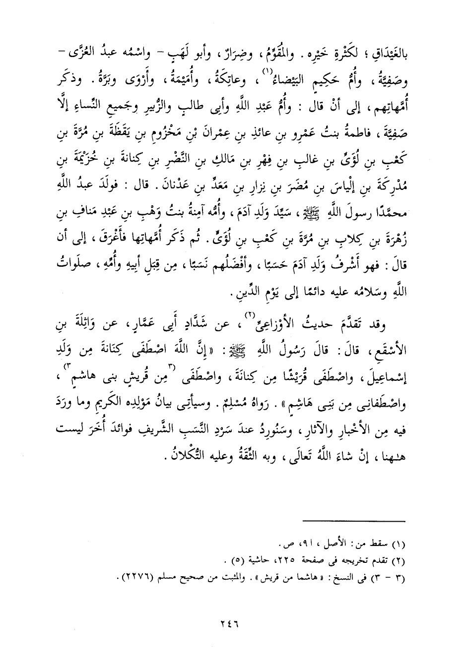 وَقَدْ تَقَدَّمَ حَدِيثُ الْأَوْزَاعِيِّ عَنْ شَدَّادٍ أَبِي عَمَّارٍ عَنْ وَاثِلَةَ بْنِ الْأَسْقَعِ قَالَ قَالَ رَسُولُ اللَّهِ صَلَّى اللَّهُ عَلَيْهِ وَسَلَّمَ: «إِنَّ اللَّهَ اصْطَفَى كِنَانَةَ مِنْ وَلَدِ إِسْمَاعِيلَ، وَاصْطَفَى قُرَيْشًا مِنْ كِنَانَةَ، وَاصْطَفَى مِنْ قُرَيْشٍ بَنِي هَاشِمٍ، وَاصْطَفَانِي مِنْ بَنِي هَاشِمٍ» رَوَاهُ مُسْلِمٌ، وَسَيَأْتِي بَيَانُ مَوْلِدِهِ الْكَرِيمِ وَمَا وَرَدَ فِيهِ مِنَ الْأَخْبَارِ وَالْآثَارِ، وَسَنُورِدُ عِنْدَ سَرْدِ النَّسَبِ الشَّرِيفِ فَوَائِدَ أُخَرَ لَيْسَتْ هَاهُنَا إِنْ شَاءَ اللَّهُ تَعَالَى وَبِهِ الثِّقَةُ، وَعَلَيْهِ التُّكْلَانُ.