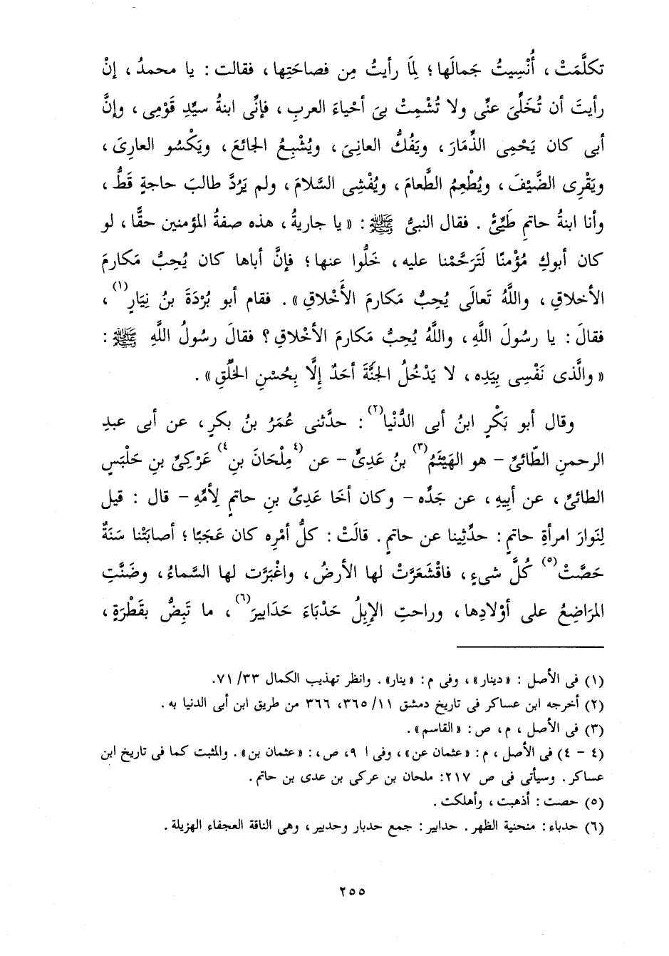 تَكَلَّمْتُ أُنْسِيتُ جَمَالَهَا; لِمَا رَأَيْتُ مِنْ فَصَاحَتِهَا فَقَالَتْ: يَا مُحَمَّدُ إِنْ رَأَيْتَ أَنْ تُخَلِّيَ عَنِّي وَلَا تُشْمِتْ بِيَ أَحْيَاءَ الْعَرَبِ فَإِنِّي ابْنَةُ سَيِّدِ قَوْمِي، وَإِنَّ أَبِي كَانَ يَحْمِي الذِّمَارَ، وَيَفُكُّ الْعَانِيَ، وَيُشْبِعُ الْجَائِعَ، وَيَكْسُو الْعَارِيَ، وَيَقْرِي الضَّيْفَ، وَيُطْعِمُ الطَّعَامَ، وَيُفْشِي السَّلَامَ، وَلَمْ يَرُدَّ طَالِبَ حَاجَةٍ قَطُّ، وَأَنَا ابْنَةُ حَاتِمِ طَيِّئٍ فَقَالَ النَّبِيُّ صَلَّى اللَّهُ عَلَيْهِ وَسَلَّمَ يَا جَارِيَةُ هَذِهِ صِفَةُ الْمُؤْمِنِينَ حَقًّا لَوْ كَانَ أَبُوكِ مُؤْمِنًا لَتَرَحَّمْنَا عَلَيْهِ خَلُّوا عَنْهَا فَإِنَّ أَبَاهَا كَانَ يُحِبُّ مَكَارِمَ الْأَخْلَاقِ وَاللَّهُ تَعَالَى يُحِبُّ مَكَارِمَ الْأَخْلَاقِ فَقَامَ أَبُو بُرْدَةَ بْنُ نِيَارٍ فَقَالَ: يَا رَسُولَ اللَّهِ وَاللَّهُ يُحِبُّ مَكَارِمَ الْأَخْلَاقِ؟ فَقَالَ رَسُولُ اللَّهِ صَلَّى اللَّهُ عَلَيْهِ وَسَلَّمَ: وَالَّذِي نَفْسِي بِيَدِهِ لَا يَدْخُلُ الْجَنَّةَ أَحَدٌ إِلَّا بِحُسْنِ الْخُلُقِ» .