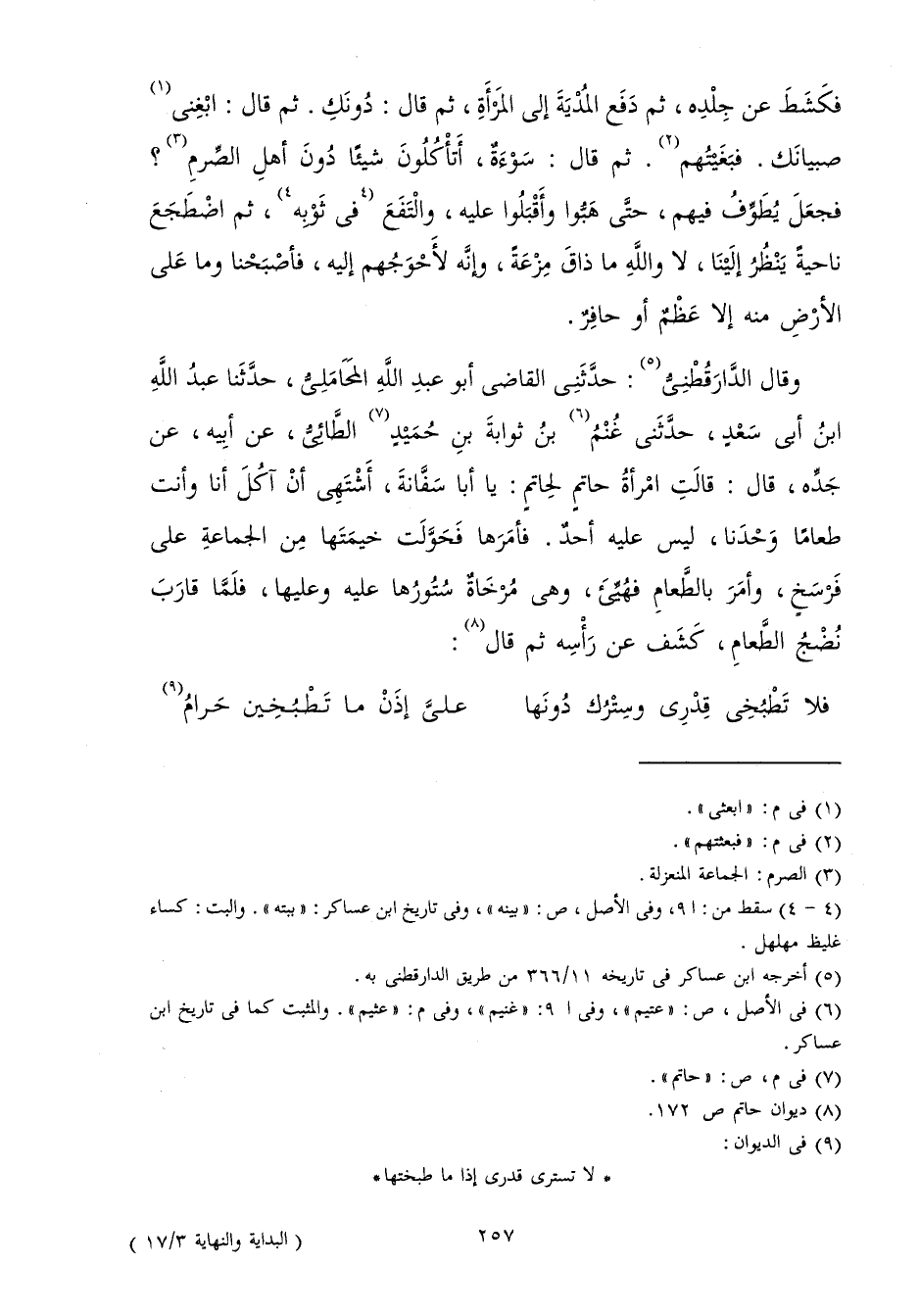 وَقَالَ الدَّارَقُطْنِيُّ: حَدَّثَنِي الْقَاضِي أَبُو عَبْدِ اللَّهِ الْمَحَامِلِيُّ حَدَّثَنَا عَبْدُ اللَّهِ بْنُ أَبِي سَعْدٍ، وَحَدَّثَنَا غُنْمُ بْنُ ثَوَابَةَ بْنِ حُمَيْدٍ الطَّائِيُّ عَنْ أَبِيهِ عَنْ جَدِّهِ قَالَ: قَالَتِ امْرَأَةُ حَاتِمٍ لِحَاتِمٍ: يَا أَبَا سَفَّانَةَ أَشْتَهِي أَنْ آكُلَ أَنَا وَأَنْتَ طَعَامًا وَحْدَنَا لَيْسَ عَلَيْهِ أَحَدٌ فَأَمَرَهَا فَحَوَّلَتْ خَيْمَتَهَا مِنَ الْجَمَاعَةِ عَلَى فَرْسَخٍ، وَأَمَرَ بِالطَّعَامِ فَهُيِّئَ، وَهِيَ مُرْخَاةٌ سُتُورُهَا عَلَيْهِ وَعَلَيْهَا فَلَمَّا قَارَبَ نُضْجُ الطَّعَامِ كَشَفَ عَنْ رَأْسِهِ ثُمَّ قَالَ: