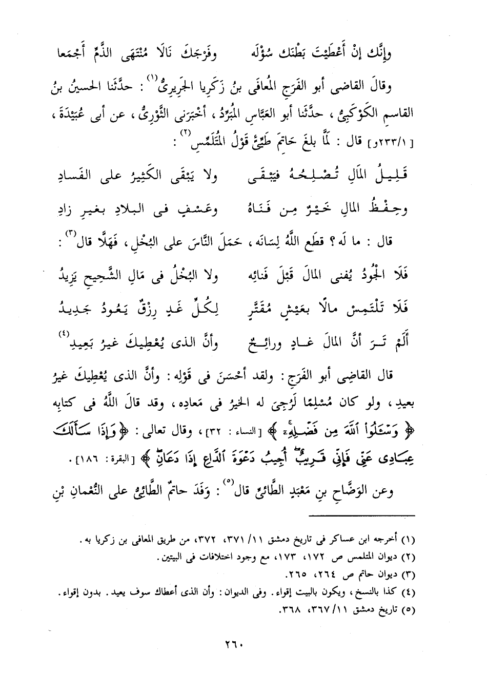 وَقَالَ الْقَاضِي أَبُو الْفَرَجِ الْمُعَافَى بْنُ زَكَرِيَّاءَ الْجَرِيرِيُّ: حَدَّثَنَا الْحُسَيْنُ بْنُ الْقَاسِمِ الْكَوْكَبِيُّ حَدَّثَنَا أَبُو الْعَبَّاسِ الْمُبَرِّدُ أَخْبَرَنِي الثَّوْرِيُّ عَنْ أَبِي عُبَيْدَةَ قَالَ: لَمَّا بَلَغَ حَاتِمَ طَيِّئٍ قَوْلُ الْمُتَلَمِّسِ