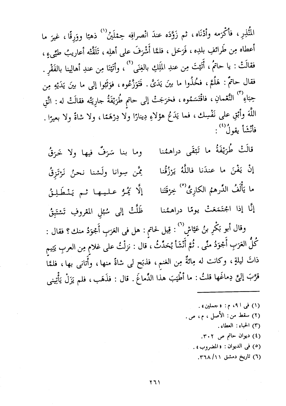 فَأَكْرَمَهُ وَأَدْنَاهُ، ثُمَّ زَوَّدَهُ عِنْدَ انْصِرَافِهِ حِمْلَيْنِ ذَهَبًا وَوَرِقًا، غَيْرَ مَا أَعْطَاهُ مِنْ طَرَائِفِ بَلَدِهِ فَرَحَلَ فَلَمَّا أَشْرَفَ عَلَى أَهْلِهِ تَلَقَّتْهُ أَعَارِيبُ طَيِّئٍ فَقَالَتْ: يَا حَاتِمُ أَتَيْتَ مِنْ عِنْدِ الْمَلِكِ، وَأَتَيْنَا مِنْ عِنْدِ أَهَالِينَا بِالْفَقْرِ فَقَالَ حَاتِمٌ: هَلُمَّ فَخُذُوا مَا بَيْنَ يَدِيَّ فَتَوَزَّعُوهُ فَوَثَبُوا إِلَى مَا بَيْنَ يَدَيْهِ مِنْ حِبَاءِ النُّعْمَانِ فَاقْتَسَمُوهُ فَخَرَجَتْ إِلَى حَاتِمٍ طَرِيفَةُ جَارِيَتُهُ فَقَالَتْ لَهُ: اتَّقِ اللَّهَ وَأَبْقِ عَلَى نَفْسِكَ فَمَا يَدَعُ هَؤُلَاءِ دِينَارًا وَلَا دِرْهَمًا وَلَا شَاةً وَلَا بَعِيرًا فَأَنْشَأَ يَقُولُ: