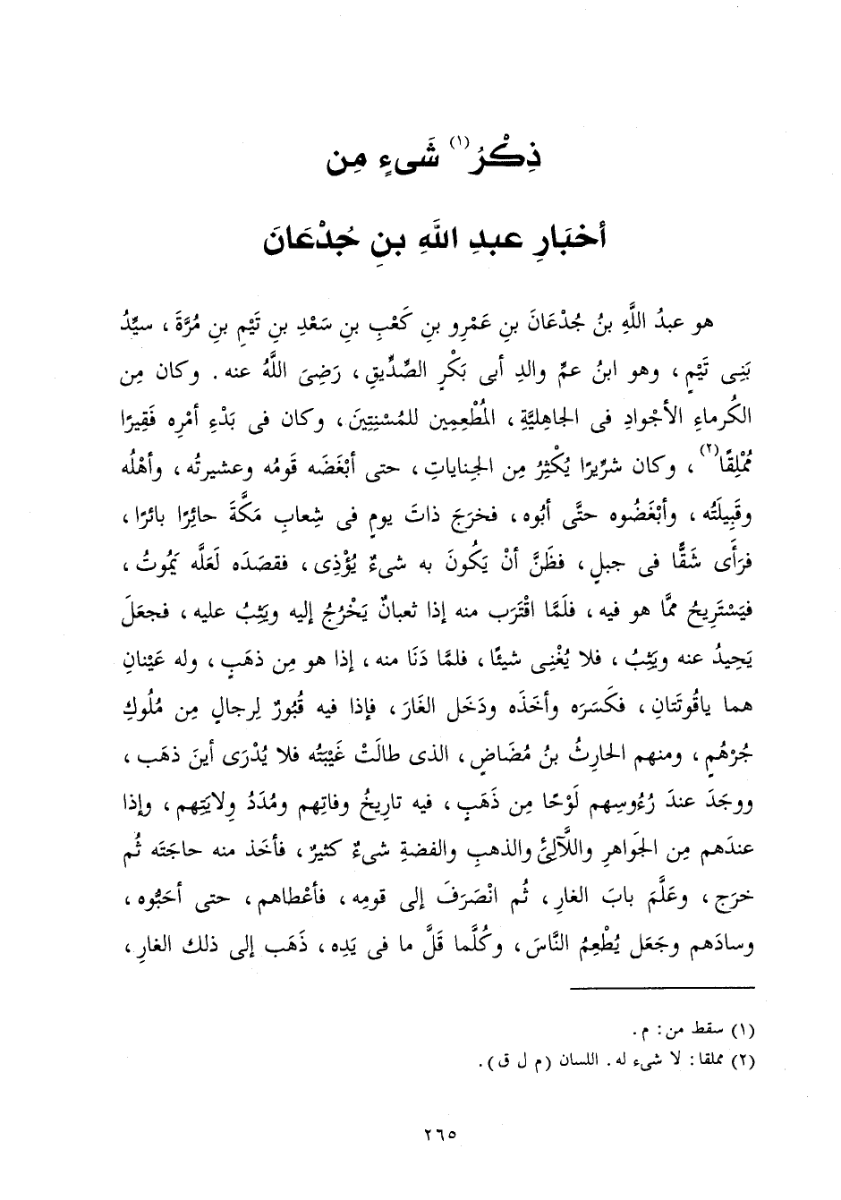 هُوَ عَبْدُ اللَّهِ بْنُ جُدْعَانَ بْنِ عَمْرِو بْنِ كَعْبِ بْنِ سَعْدِ بْنِ تَيْمِ بْنِ مُرَّةَ سَيِّدُ بَنِي تَيْمٍ، وَهُوَ ابْنُ عَمِّ وَالِدِ أَبِي بَكْرٍ الصِّدِّيقِ رَضِيَ اللَّهُ عَنْهُ وَكَانَ مِنَ الْكُرَمَاءِ الْأَجْوَادِ فِي الْجَاهِلِيَّةِ الْمُطْعِمِينَ لِلْمُسْنِتِينَ وَكَانَ فِي بَدْءِ أَمْرِهِ فَقِيرًا مُمْلِقًا وَكَانَ شِرِّيرًا يُكْثِرُ مِنَ الْجِنَايَاتِ حَتَّى أَبْغَضَهُ قَوْمُهُ وَعَشِيرَتُهُ وَأَهْلُهُ وَقَبِيلَتُهُ وَأَبْغَضُوهُ حَتَّى أَبُوهُ فَخَرَجَ ذَاتَ يَوْمٍ فِي شِعَابِ مَكَّةَ حَائِرًا بَائِرًا فَرَأَى شَقًّا فِي جَبَلٍ فَظَنَّ أَنْ يَكُونَ بِهِ شَيْءٌ يُؤْذِي فَقَصَدَهُ لَعَلَّهُ يَمُوتُ فَيَسْتَرِيحُ مِمَّا هُوَ فِيهِ فَلَمَّا اقْتَرَبَ مِنْهُ إِذَا ثُعْبَانٌ يَخْرُجُ إِلَيْهِ وَيَثِبُ عَلَيْهِ فَجَعَلَ يَحِيدُ عَنْهُ وَيَثِبُ فَلَا يُغْنِي شَيْئًا فَلَمَّا دَنَا مِنْهُ إِذَا هُوَ مِنْ ذَهَبٍ وَلَهُ عَيْنَانِ هُمَا يَاقُوتَتَانِ فَكَسَرَهُ وَأَخَذَهُ وَدَخَلَ الْغَارَ فَإِذَا فِيهِ قُبُورٌ لِرِجَالٍ مَنْ مُلُوكِ جُرْهُمٍ، وَمِنْهُمُ الْحَارِثُ بْنُ مُضَاضٍ، الَّذِي طَالَتْ غَيْبَتُهُ فَلَا يُدْرَى أَيْنَ ذَهَبَ، وَوَجَدَ عِنْدَ رُءُوسِهِمْ لَوْحًا مِنْ ذَهَبٍ فِيهِ تَارِيخُ وَفَاتِهِمْ وَمُدَدُ وِلَايَتِهِمْ، وَإِذَا عِنْدَهُمْ مِنَ الْجَوَاهِرِ وَاللَّآلِئِ وَالذَّهَبِ وَالْفِضَّةِ شَيْءٌ كَثِيرٌ فَأَخَذَ مِنْهُ حَاجَتَهُ ثُمَّ خَرَجَ وَعَلَّمَ بَابَ الْغَارِ، ثُمَّ انْصَرَفَ إِلَى قَوْمِهِ فَأَعْطَاهُمْ حَتَّى أَحَبُّوهُ وَسَادَهُمْ، وَجَعَلَ يُطْعِمُ النَّاسَ، وَكُلَّمَا قَلَّ مَا فِي يَدِهِ ذَهَبَ إِلَى ذَلِكَ الْغَارِ