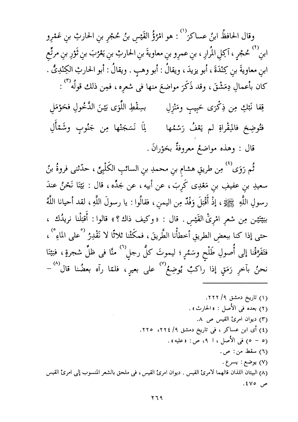 وَقَالَ الْحَافِظُ ابْنُ عَسَاكِرَ: هُوَ امْرُؤُ الْقَيْسِ بْنُ حُجْرِ بْنِ الْحَارِثِ بْنِ عَمْرِو بْنِ حُجْرٍ آكِلِ الْمُرَارِ بْنِ عَمْرِو بْنِ مُعَاوِيَةَ بْنِ الْحَارِثِ بْنِ يَعْرُبَ بْنِ ثَوْرِ بْنِ مُرَتِّعِ بْنِ مُعَاوِيَةَ بْنِ كِنْدَةَ أَبُو يَزِيدَ، وَيُقَالَ: أَبُو وَهْبٍ وَيُقَالُ: أَبُو الْحَارِثِ الْكِنْدِيُّ، كَانَ بِأَعْمَالِ دِمَشْقَ وَقَدْ ذَكَرَ مَوَاضِعَ مِنْهَا فِي شِعْرِهِ فَمِنْ ذَلِكَ قَوْلُهُ