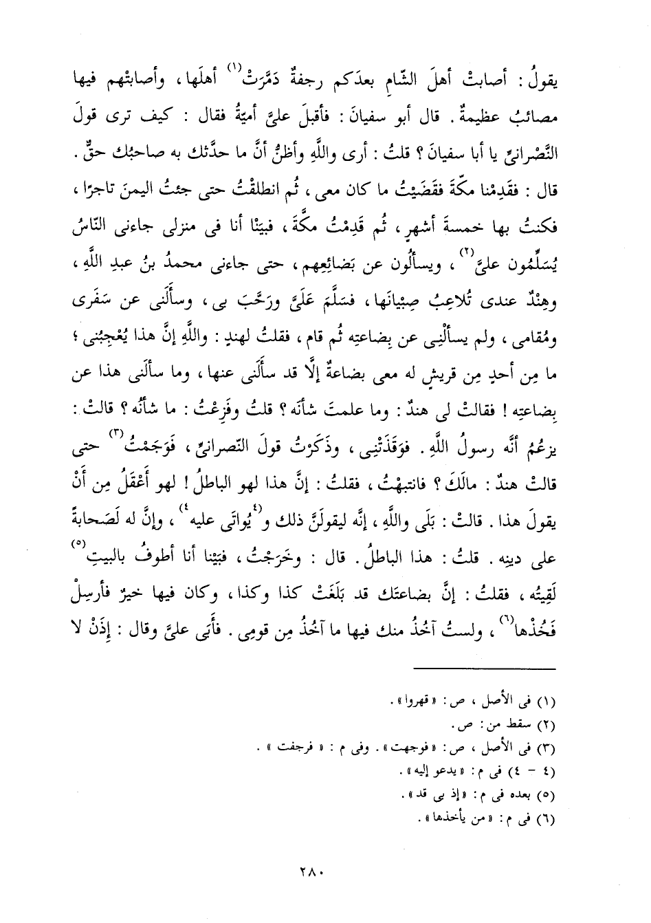 يَقُولُ: أَصَابَتْ أَهْلَ الشَّامِ بَعْدَكُمْ رَجْفَةٌ دَمَّرَتْ أَهْلَهَا، وَأَصَابَتْهُمْ فِيهَا مَصَائِبُ عَظِيمَةٌ. قَالَ أَبُو سُفْيَانَ: فَأَقْبَلَ عَلَيَّ أُمَيَّةُ فَقَالَ: كَيْفَ تَرَى قَوْلَ النَّصْرَانِيِّ يَا أَبَا سُفْيَانَ؟ قُلْتُ: أَرَى وَأَظُنُّ وَاللَّهِ أَنَّ مَا حَدَّثَكَ بِهِ صَاحِبُكَ حَقٌّ. قَالَ: فَقَدِمْنَا مَكَّةَ فَقَضَيْتُ مَا كَانَ مَعِي، ثُمَّ انْطَلَقْتُ حَتَّى جِئْتُ الْيَمَنَ تَاجِرًا فَكُنْتُ بِهَا خَمْسَةَ أَشْهُرٍ، ثُمَّ قَدِمْتُ مَكَّةَ فَبَيْنَا أَنَا فِي مَنْزِلِي جَاءَنِي النَّاسُ يُسَلِّمُونَ عَلَيَّ، وَيَسْأَلُونَ عَنْ بَضَائِعِهِمْ حَتَّى جَاءَنِي مُحَمَّدُ بْنُ عَبْدِ اللَّهِ، وَهِنْدٌ عِنْدِي تُلَاعِبُ صِبْيَانَهَا فَسَلَّمَ عَلَيَّ وَرَحَّبَ بِي، وَسَأَلَنِي عَنْ سَفَرِي وَمُقَامِي، وَلَمْ يَسْأَلْنِي عَنْ بِضَاعَتِهِ ثُمَّ قَامَ. فَقُلْتُ لِهِنْدٍ: وَاللَّهِ إِنَّ هَذَا لَيُعْجِبُنِي مَا مِنْ أَحَدٍ مِنْ قُرَيْشٍ لَهُ مَعِي بِضَاعَةٌ إِلَّا وَقَدْ سَأَلَنِي عَنْهَا وَمَا سَأَلَنِي هَذَا عَنْ بِضَاعَتِهِ! فَقَالَتْ لِي هِنْدٌ: وَمَا عَلِمْتَ شَأْنَهُ؟ فَقُلْتُ، وَفَزِعْتُ: مَا شَأْنُهُ؟ قَالَتْ: يَزْعُمُ أَنَّهُ رَسُولُ اللَّهِ. فَوَقَذَتْنِي وَذَكَرْتُ قَوْلَ النَّصْرَانِيِّ فَوَجَمْتُ حَتَّى قَالَتْ لِي هِنْدٌ: مَالَكَ؟ فَانْتَبَهْتُ فَقُلْتُ: إِنَّ هَذَا لَهُوَ الْبَاطِلُ! لَهُوَ أَعْقَلُ مِنْ أَنْ يَقُولَ هَذَا. قَالَتْ: بَلَى وَاللَّهِ إِنَّهُ لَيَقُولَنَّ ذَلِكَ وَيُوَاتَى عَلَيْهِ، وَإِنَّ لَهُ لِصَحَابَةٌ عَلَى دِينِهِ. قُلْتُ: هَذَا هُوَ الْبَاطِلُ قَالَ: وَخَرَجَتْ فَبَيْنَا أَنَا أَطُوفُ بِالْبَيْتِ لَقِيتُهُ فَقُلْتُ لَهُ إِنَّ بِضَاعَتَكَ قَدْ بَلَغَتْ كَذَا وَكَذَا وَكَانَ فِيهَا خَيْرٌ فَأَرْسِلْ فَخُذْهَا وَلَسْتُ آخُذُ مِنْكَ فِيهَا مَا آخُذُ مِنْ قَوْمِي فَأَبَى عَلَيَّ، وَقَالَ: إِذَنْ لَا