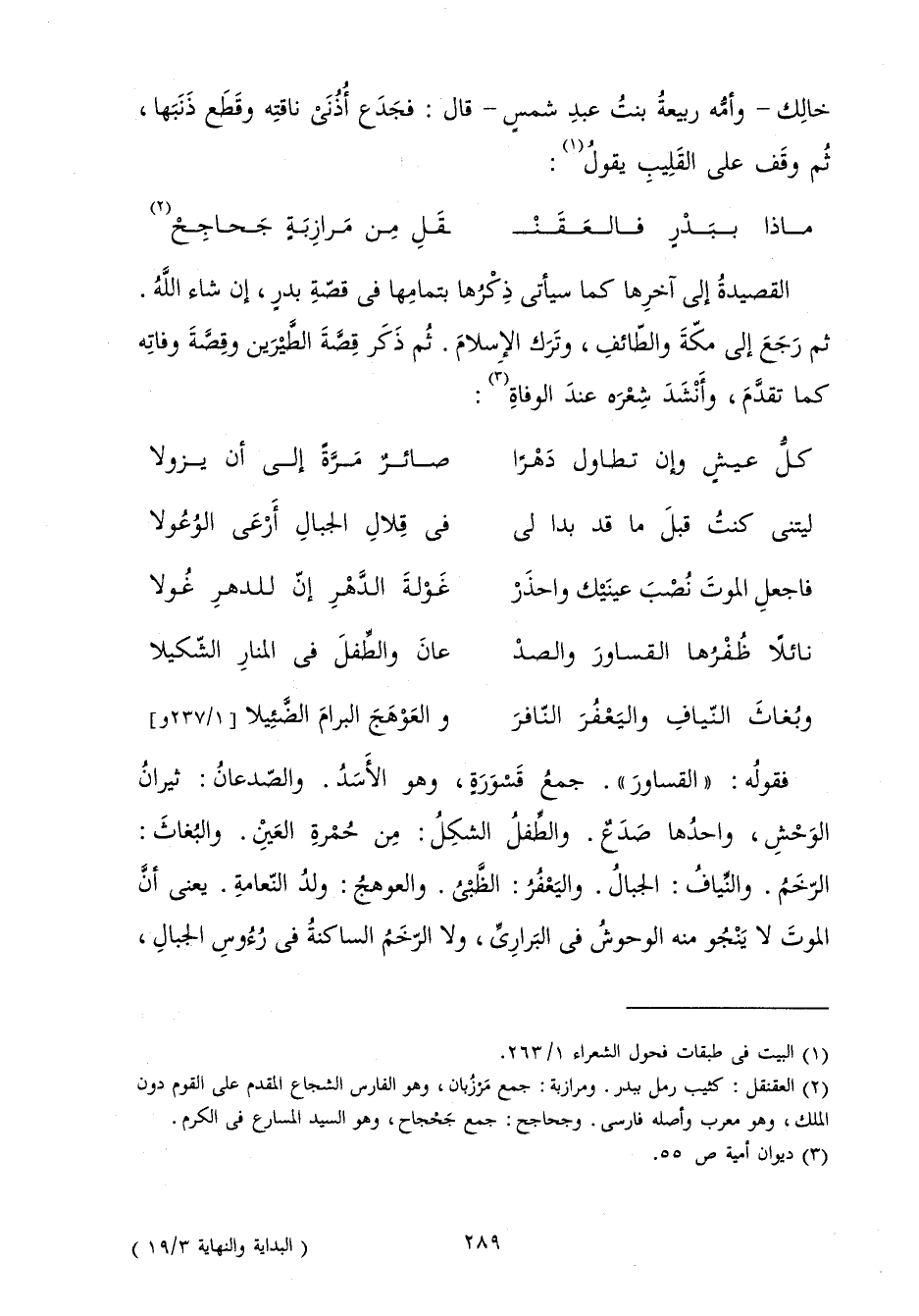 الْقَصِيدَةَ إِلَى آخِرِهَا كَمَا سَيَأْتِي ذِكْرُهَا بِتَمَامِهَا فِي قِصَّةِ بَدْرٍ إِنْ شَاءَ اللَّهُ، ثُمَّ رَجَعَ إِلَى مَكَّةَ وَالطَّائِفِ وَتَرَكَ الْإِسْلَامَ. ثُمَّ ذَكَرَ قِصَّةَ الطَّيْرَيْنِ وَقِصَّةَ وَفَاتِهِ كَمَا تَقَدَّمَ، وَأَنْشَدَ شِعْرَهُ عِنْدَ الْوَفَاةِ