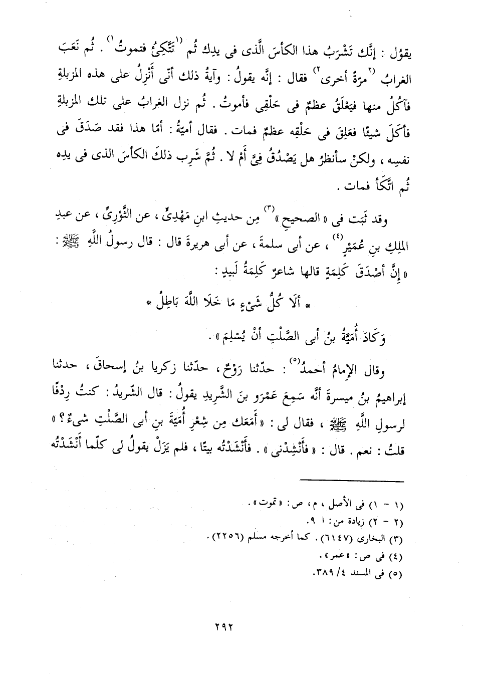 وَقَالَ الْإِمَامُ أَحْمَدُ: حَدَّثَنَا رَوْحٌ حَدَّثَنَا زَكَرِيَّا بْنُ إِسْحَاقَ حَدَّثَنَا ابْرَاهِيمُ بْنُ مَيْسَرَةَ أَنَّهُ سَمِعَ عَمْرَو بْنَ الشَّرِيدِ يَقُولُ: قَالَ الشَّرِيدُ «: كُنْتُ رِدْفًا لِرَسُولِ اللَّهِ صَلَّى اللَّهُ عَلَيْهِ وَسَلَّمَ فَقَالَ لِي: أَمَعَكَ مِنْ شِعْرِ أُمَيَّةَ بْنِ أَبِي الصَّلْتِ شَيْءٌ؟ قُلْتُ: نَعَمْ. قَالَ: فَأَنْشِدْنِي. فَأَنْشَدْتُهُ بَيْتًا فَلَمْ يَزَلْ يَقُولُ كُلَّمَا أَنْشَدْتُهُ