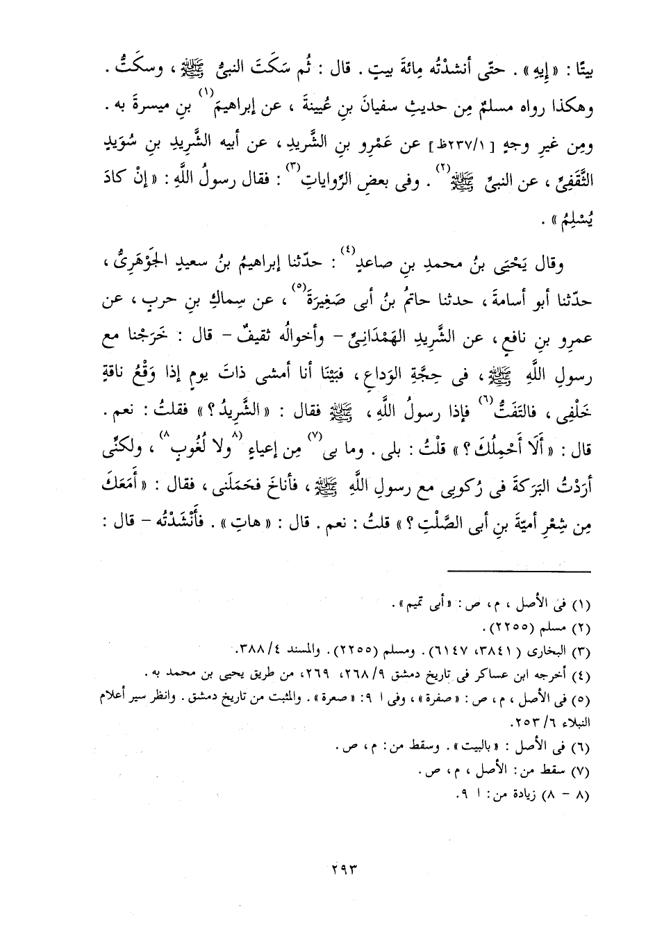وَقَالَ يَحْيَى بْنُ مُحَمَّدِ بْنِ صَاعِدٍ: حَدَّثَنَا ابْرَاهِيمُ بْنُ سَعِيدٍ الْجَوْهَرِيُّ حَدَّثَنَا أَبُو أُسَامَةَ حَدَّثَنَا حَاتِمُ بْنُ أَبِي صَغِيرَةَ عَنْ سِمَاكِ بْنِ حَرْبٍ عَنْ عَمْرِو بْنِ نَافِعٍ عَنِ الشَّرِيدِ الْهَمْدَانِيِّ - وَأَخْوَالُهُ ثَقِيفٌ - قَالَ «خَرَجْنَا مَعَ رَسُولِ اللَّهِ صَلَّى اللَّهُ عَلَيْهِ وَسَلَّمَ فِي حَجَّةِ الْوَدَاعِ فَبَيْنَا أَنَا أَمْشِي ذَاتَ يَوْمٍ إِذَا وَقْعُ نَاقَةٍ خَلْفِي فَإِذَا رَسُولُ اللَّهِ صَلَّى اللَّهُ عَلَيْهِ وَسَلَّمَ فَقَالَ الشَّرِيدُ؟ فَقُلْتُ: نَعَمْ. قَالَ: أَلَا أَحْمِلُكَ؟ قُلْتُ: بَلَى وَمَا بِي مِنْ إِعْيَاءٍ وَلَا لُغُوبٍ، وَلَكِنِّي أَرَدْتُ الْبَرَكَةَ فِي رُكُوبِي مَعَ رَسُولِ اللَّهِ صَلَّى اللَّهُ عَلَيْهِ وَسَلَّمَ فَأَنَاخَ فَحَمَلَنِي. فَقَالَ: أَمَعَكَ مَنْ شِعْرِ أُمَيَّةَ بْنِ أَبِي الصَّلْتِ؟ قُلْتُ: نَعَمْ. قَالَ: هَاتِ. فَأَنْشَدْتُهُ - قَالَ