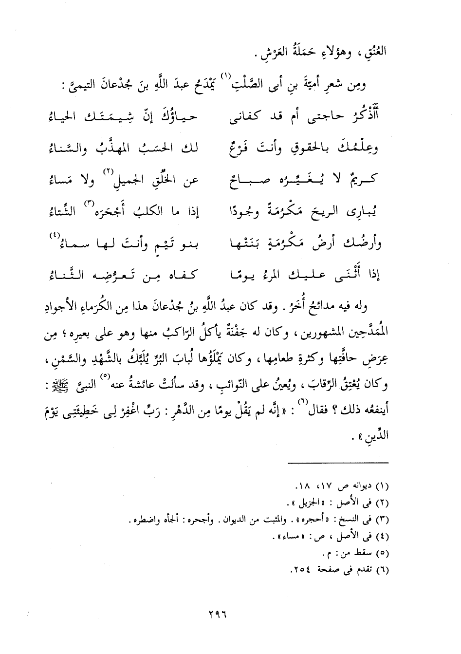 الْعُنُقِ، وَهَؤُلَاءِ حَمَلَةُ الْعَرْشِ. وَمِنْ شِعْرِ أُمَيَّةَ بْنِ أَبِي الصَّلْتِ يَمْدَحُ عَبْدَ اللَّهِ بْنَ جُدْعَانَ التَّيْمِيَّ: