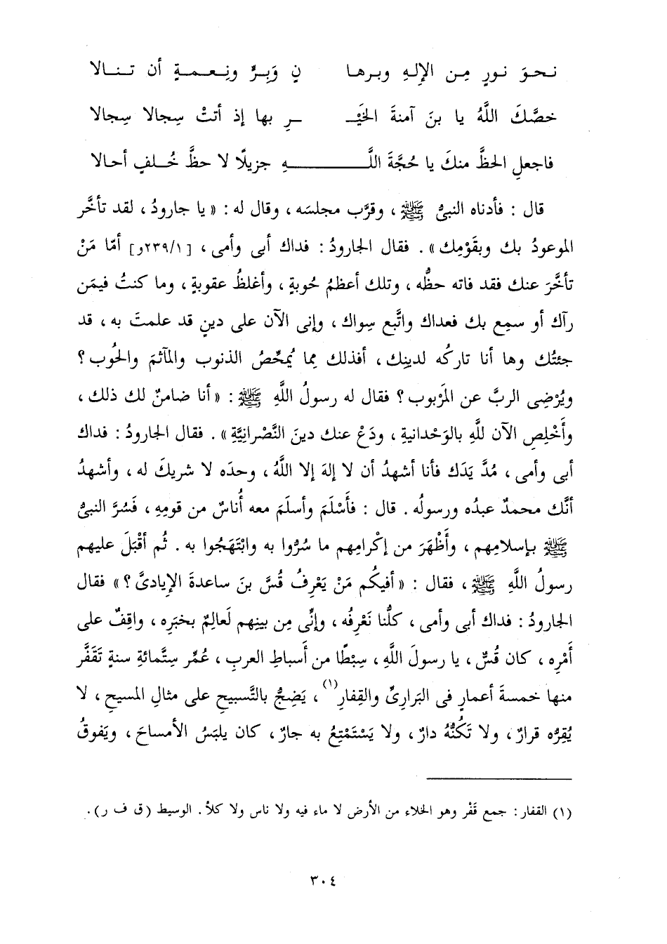 قَالَ: فَأَدْنَاهُ النَّبِيُّ صَلَّى اللَّهُ عَلَيْهِ وَسَلَّمَ وَقَرَّبَ مَجْلِسَهُ، وَقَالَ لَهُ: يَا جَارُودُ لَقَدْ تَأَخَّرَ الْمَوْعُودُ بِكَ وَبِقَوْمِكَ. فَقَالَ الْجَارُودُ: فِدَاكَ أَبِي وَأُمِّي أَمَّا مَنْ تَأَخَّرَ عَنْكَ فَقَدْ فَاتَهُ حَظُّهُ، وَتِلْكَ أَعْظَمُ حُوبَةٍ وَأَغْلَظُ عُقُوبَةٍ وَمَا كُنْتَ فِيمَنْ رَآكَ أَوْ سَمِعَ بِكَ فَعَدَاكَ وَاتَّبَعَ سِوَاكَ، وَإِنِّي الْآنَ عَلَى دِينٍ قَدْ عَلِمْتُ بِهِ قَدْ جِئْتُكَ، وَهَا أَنَا تَارِكُهُ لِدِينِكَ، أَفَذَلِكَ مِمَّا يُمَحِّصُ الذُّنُوبَ وَالْمَآثِمَ وَالْحُوبَ؟ وَيُرْضِي الرَّبَّ عَنِ الْمَرْبُوبِ؟ فَقَالَ لَهُ رَسُولُ اللَّهِ صَلَّى اللَّهُ عَلَيْهِ وَسَلَّمَ: أَنَا ضَامِنٌ لَكَ ذَلِكَ، وَأَخْلِصِ الْآنَ لِلَّهِ بِالْوَحْدَانِيَّةِ، وَدَعْ عَنْكَ دِينَ النَّصْرَانِيَّةِ. فَقَالَ الْجَارُودُ: فِدَاكَ أَبِي وَأُمِّي مُدَّ يَدَكَ فَأَنَا أَشْهَدُ أَنْ لَا إِلَهَ إِلَّا اللَّهُ وَحْدَهُ لَا شَرِيكَ لَهُ، وَأَشْهَدُ أَنَّكَ مُحَمَّدٌ عَبْدُهُ وَرَسُولُهُ. قَالَ: فَأَسْلَمَ وَأَسْلَمَ مَعَهُ أُنَاسٌ مِنْ قَوْمِهِ فَسُرَّ النَّبِيُّ صَلَّى اللَّهُ عَلَيْهِ وَسَلَّمَ بِإِسْلَامِهِمْ، وَأَظْهَرَ مِنْ إِكْرَامِهِمْ مَا سُرُّوا بِهِ وَابْتَهَجُوا بِهِ، ثُمَّ أَقْبَلَ عَلَيْهِمْ رَسُولُ اللَّهِ صَلَّى اللَّهُ عَلَيْهِ وَسَلَّمَ فَقَالَ: أَفَيَكِمْ مَنْ يَعْرِفُ قُسَّ بْنَ سَاعِدَةَ الْإِيَادِيَّ؟ فَقَالَ الْجَارُودُ: فِدَاكَ أَبِي وَأُمِّي كُلُّنَا نَعْرِفُهُ، وَإِنِّي مِنْ بَيْنِهِمْ لَعَالِمٌ بِخَبَرِهِ وَاقِفٌ عَلَى أَمْرِهِ، كَانَ قَسٌّ يَا رَسُولَ اللَّهِ سِبْطًا مِنْ أَسْبَاطِ الْعَرَبِ، عُمِّرَ سِتَّمِائَةِ سَنَةٍ تَقَفَّرَ مِنْهَا خَمْسَةَ أَعْمَارٍ فِي الْبَرَارِيِّ وَالْقِفَارِ يَضِجُّ بِالتَّسْبِيحِ عَلَى مِثَالِ الْمَسِيحِ لَا يُقِرُّهُ قَرَارٌ وَلَا تَكُنُّهُ دَارٌ وَلَا يَسْتَمْتِعُ بِهِ جَارٌ كَانَ يَلْبَسُ الْأَمْسَاحَ، وَيَفُوقُ