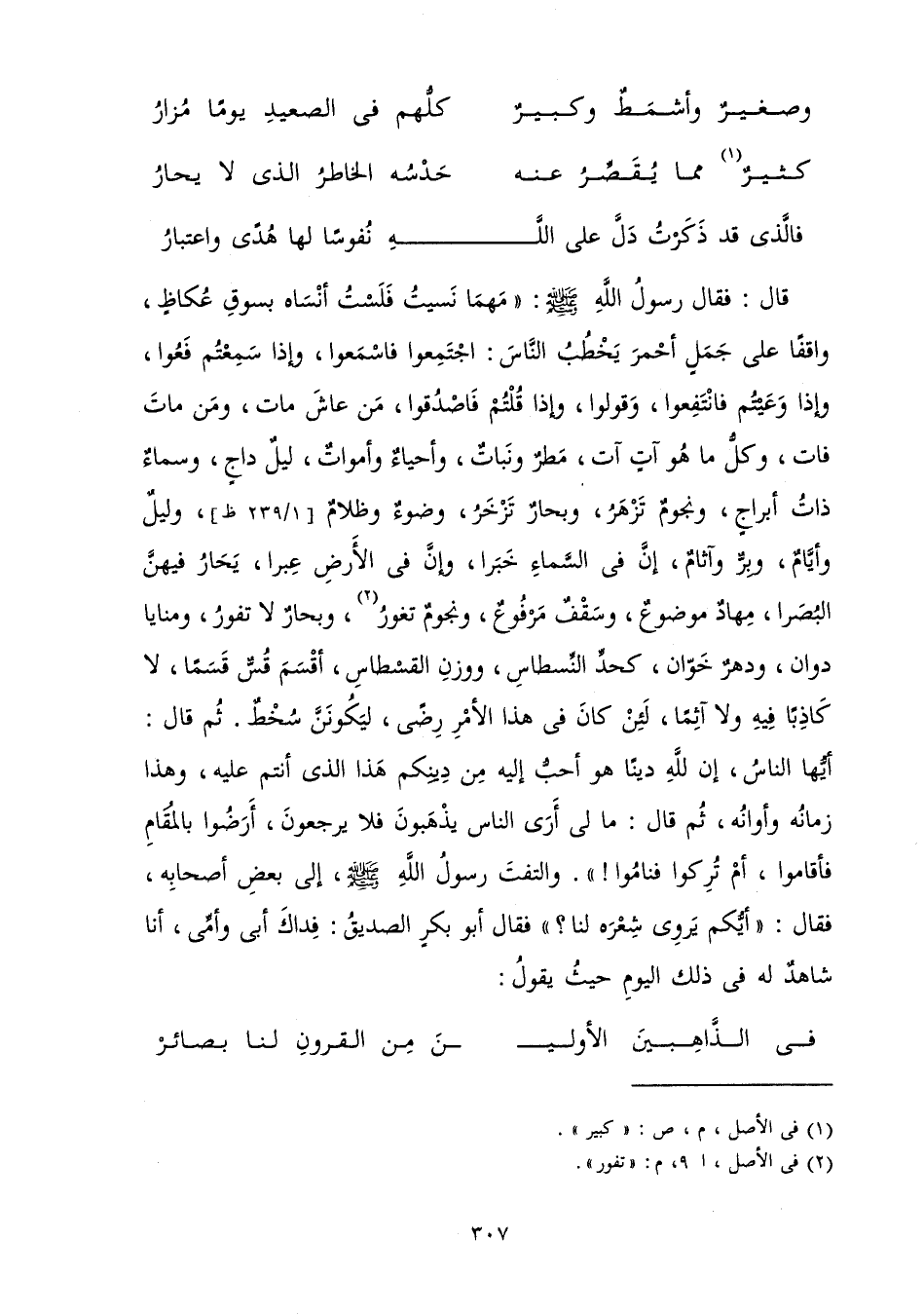 قَالَ: فَقَالَ رَسُولُ اللَّهِ صَلَّى اللَّهُ عَلَيْهِ وَسَلَّمَ: مَهْمَا نَسِيتُ فَلَسْتُ أَنْسَاهُ بِسُوقِ عُكَاظٍ، وَاقِفًا عَلَى جَمَلٍ أَحْمَرَ يَخْطُبُ النَّاسَ: اجْتَمِعُوا فَاسْمَعُوا وَإِذَا سَمِعْتُمْ فَعُوا وَإِذَا وَعَيْتُمْ فَانْتَفِعُوا وَقُولُوا وَإِذَا قُلْتُمْ فَاصْدُقُوا. مَنْ عَاشَ مَاتَ وَمَنْ مَاتَ فَاتَ وَكُلُّ مَا هُوَ آتٍ آتٍ، مَطَرٌ وَنَبَاتٌ وَأَحْيَاءٌ وَأَمْوَاتٌ، لَيْلٌ دَاجٍ وَسَمَاءٌ ذَاتُ أَبْرَاجٍ، وَنُجُومٌ تَزْهَرُ، وَبِحَارُ تَزْخَرُ وَضَوْءٌ وَظَلَامٌ، وَلَيْلٌ وَأَيَّامٌ وَبِرٌّ وَآثَامٌ، إِنَّ فِي السَّمَاءِ خَبَرًا، وَإِنَّ فِي الْأَرْضِ عِبَرًا، يَحَارُ فِيهِنَّ الْبُصَرَا، مِهَادٌ مَوْضُوعٌ، وَسَقْفٌ مَرْفُوعٌ، وَنُجُومٌ تَغُورُ، وَبِحَارٌ لَا تَفُورُ، وَمَنَايَا دَوَانٍ، وَدَهْرٌ خَوَّانٌ كَحَدِّ النِّسْطَاسِ وَوَزْنِ الْقِسْطَاسِ، أَقْسَمَ قُسٌّ قَسَمًا لَا كَاذِبًا فِيهِ وَلَا آثِمًا لَئِنْ كَانَ فِي هَذَا الْأَمْرِ رِضًى لَيَكُونَنَّ سَخَطٌ. ثُمَّ قَالَ: أَيُّهَا النَّاسُ إِنَّ لِلَّهِ دِينًا هُوَ أَحَبُّ إِلَيْهِ مِنْ دِينِكُمْ هَذَا الَّذِي أَنْتُمْ عَلَيْهِ. وَهَذَا زَمَانُهُ وَأَوَانُهُ، ثُمَّ قَالَ: مَا لِي أَرَى النَّاسَ يَذْهَبُونَ فَلَا يَرْجِعُونَ، أَرَضُوا بِالْمُقَامِ فَأَقَامُوا أَمْ تُرِكُوا فَنَامُوا؟ وَالْتَفَتَ رَسُولُ اللَّهِ صَلَّى اللَّهُ عَلَيْهِ وَسَلَّمَ إِلَى بَعْضِ أَصْحَابِهِ فَقَالَ: أَيُّكُمْ يَرْوِي شِعْرَهُ لَنَا؟ فَقَالَ أَبُو بَكْرٍ الصِّدِّيقُ فِدَاكَ أَبِي وَأُمِّي أَنَا شَاهِدٌ لَهُ فِي ذَلِكَ الْيَوْمِ حَيْثُ يَقُولُ: