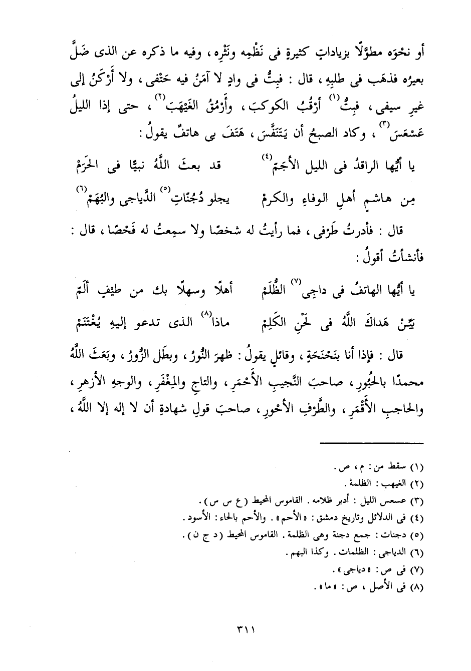 أَوْ نَحْوَهُ مُطَوَّلًا بِزِيَادَاتٍ كَثِيرَةٍ فِي نَظْمِهِ وَنَثْرِهِ، وَفِيهِ مَا ذَكَرَهُ عَنِ الَّذِي ضَلَّ بِعِيرُهُ فَذَهَبَ فِي طَلَبِهِ قَالَ: فَبِتُّ فِي وَادٍ لَا آمَنُ فِيهِ حَتْفِي وَلَا أَرْكَنُ إِلَى غَيْرِ سَيْفِي فَبِتُّ أَرْقُبُ الْكَوْكَبَ، وَأَرْمُقُ الْغَيْهَبَ حَتَّى إِذَا اللَّيْلُ عَسْعَسَ، وَكَادَ الصُّبْحُ أَنْ يَتَنَفَّسَ هَتَفَ بِيَ هَاتِفٌ يَقُولُ: