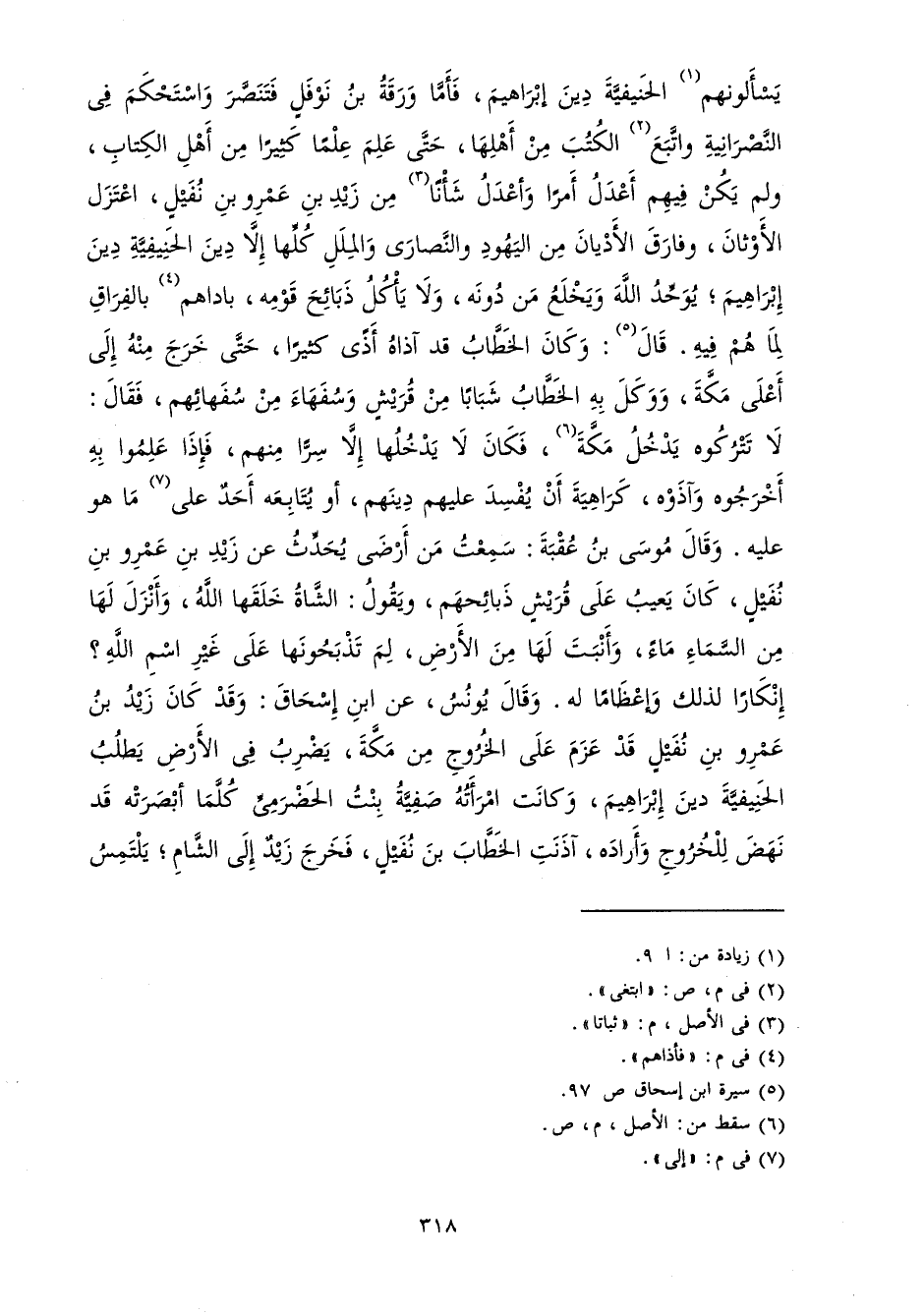 فَأَمَّا وَرَقَةُ بْنُ نَوْفَلٍ فَتَنَصَّرَ، وَاسْتَحْكَمَ فِي النَّصْرَانِيَّةِ، وَابْتَغَى الْكُتُبَ مِنْ أَهْلِهَا حَتَّى عَلِمَ عِلْمًا كَثِيرًا مِنْ أَهْلِ الْكِتَابِ، وَلَمْ يَكُنْ فِيهِمْ أَعْدَلُ أَمْرًا، وَأَعْدَلُ شَأْنًا مِنْ زَيْدِ بْنِ عَمْرِو بْنِ نُفَيْلٍ اعْتَزَلَ الْأَوْثَانَ، وَفَارَقَ الْأَدْيَانَ مِنَ الْيَهُودِ وَالنَّصَارَى وَالْمِلَلِ كُلِّهَا، إِلَّا دِينَ الْحَنِيفِيَّةِ دِينَ إِبْرَاهِيمَ يُوَحِّدُ اللَّهَ، وَيَخْلَعُ مَنْ دُونَهُ وَلَا يَأْكُلُ ذَبَائِحَ قَوْمِهِ بَادَاهُمْ بِالْفِرَاقِ لِمَا هُمْ فِيهِ. قَالَ: وَكَانَ الْخَطَّابُ قَدْ آذَاهُ أَذًى كَثِيرًا حَتَّى خَرَجَ مِنْهُ إِلَى أَعْلَى مَكَّةَ، وَوَكَّلَ بِهِ الْخَطَّابُ شَبَابًا مِنْ قُرَيْشٍ، وَسُفَهَاءَ مِنْ سُفَهَائِهِمْ فَقَالَ: لَا تَتْرُكُوهُ يَدْخُلُ مَكَّةَ فَكَانَ لَا يَدْخُلُهَا إِلَّا سِرًّا مِنْهُمْ فَإِذَا عَلِمُوا بِهِ أَخْرَجُوهُ، وَآذَوْهُ كَرَاهِيَةَ أَنْ يُفْسِدَ عَلَيْهِمْ دِينَهُمْ أَوْ يُتَابِعَهُ أَحَدٌ إِلَى مَا هُوَ عَلَيْهِ.