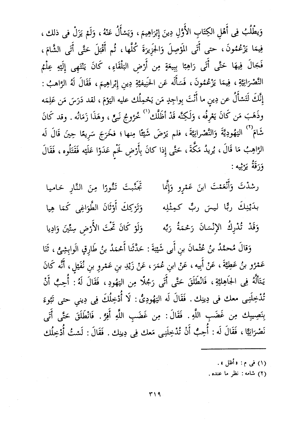 يَلْتَمِسُ وَيَطْلُبُ فِي أَهْلِ الْكِتَابِ الْأَوَّلِ دِينَ إِبْرَاهِيمَ، وَيَسْأَلُ عَنْهُ، وَلَمْ يَزَلْ فِي ذَلِكَ، - فِيمَا يَزْعُمُونَ - حَتَّى أَتَى الْمَوْصِلَ وَالْجَزِيرَةَ كُلَّهَا، ثُمَّ أَقْبَلَ حَتَّى أَتَى الشَّامَ فَجَالَ فِيهَا حَتَّى أَتَى رَاهِبًا بِبَيْعَةٍ مِنْ أَرْضِ الْبَلْقَاءِ كَانَ يَنْتَهِي إِلَيْهِ عِلْمُ النَّصْرَانِيَّةِ، - فِيمَا يَزْعُمُونَ - فَسَأَلَهُ عَنِ الْحَنِيفِيَّةِ دِينِ إِبْرَاهِيمَ فَقَالَ لَهُ الرَّاهِبُ: إِنَّكَ لَتَسْأَلُ عَنْ دِينٍ مَا أَنْتَ بِوَاجِدٍ مَنْ يَحْمِلُكُ عَلَيْهِ الْيَوْمَ لَقَدْ دَرَسَ مِنْ عَلِمَهُ، وَذَهَبَ مَنْ كَانَ يَعْرِفُهُ، وَلَكِنَّهُ قَدْ أَظَلَّكَ خُرُوجُ نَبِيٍّ. وَهَذَا زَمَانُهُ وَقَدْ كَانَ شَامَ الْيَهُودِيَّةَ وَالنَّصْرَانِيَّةَ فَلَمْ يَرْضَ شَيْئًا مِنْهَا فَخَرَجَ سَرِيعًا حِينَ قَالَ لَهُ الرَّاهِبُ مَا قَالَ يُرِيدُ مَكَّةَ حَتَّى إِذَا كَانَ بِأَرْضِ لَخْمٍ عَدَوْا عَلَيْهِ فَقَتَلُوهُ. فَقَالَ وَرَقَةُ يَرْثِيهِ: