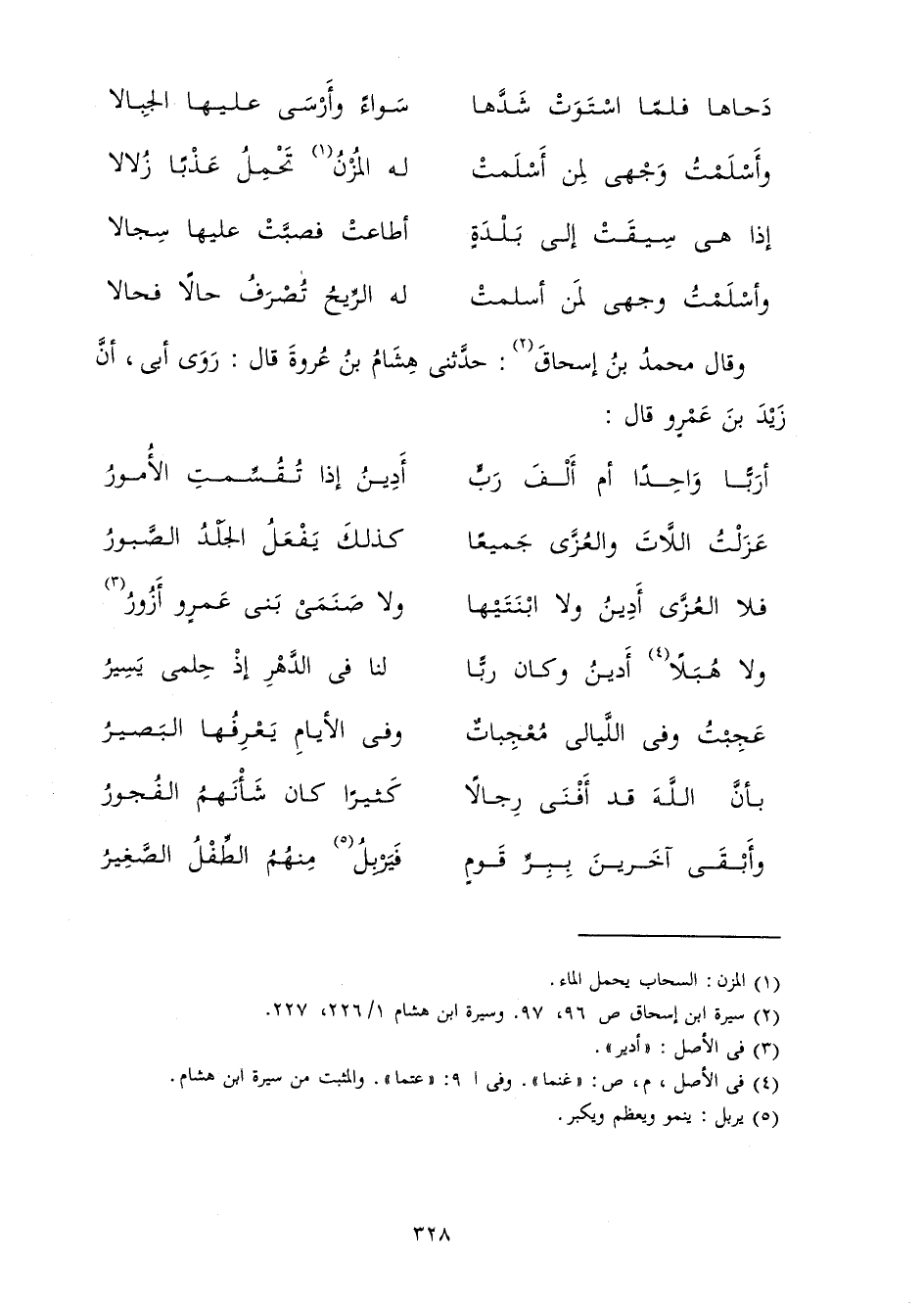 دَحَاهَا فَلَمَّا اسْتَوتْ شَدَّهَا سَوَاءً وَأَرْسَى عَلَيْهَا الْجِبَالَا وَأَسْلَمْتُ وَجْهِي لِمَنْ أَسْلَمَتْ لَهُ الْمُزْنُ تَحْمِلُ عَذْبًا زُلَالَا إِذَا هِيَ سِيقَتْ إِلَى بَلْدَةٍ أَطَاعَتْ فَصَبَّتْ عَلَيْهَا سِجَالَا وَأَسْلَمْتُ وَجْهِي لِمَنْ أَسْلَمَتْ لَهُ الرِّيحُ تُصْرَفُ حَالًا فَحَالَا وَقَالَ مُحَمَّدُ بْنُ إِسْحَاقَ: حَدَّثَنِي هِشَامُ بْنُ عُرْوَةَ قَالَ: رَوَى أَبِي أَنَّ زَيْدَ بْنَ عَمْرٍو قَالَ