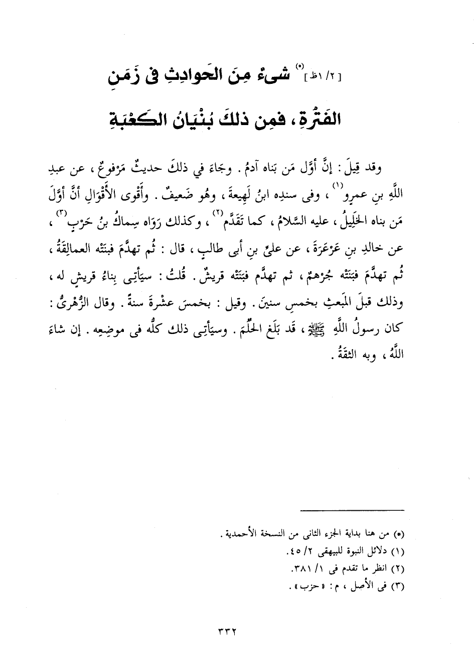 وَقَدْ قِيلَ: إِنَّ أَوَّلَ مَنْ بَنَاهُ آدَمُ. وَجَاءَ فِي ذَلِكَ حَدِيثٌ مَرْفُوعٌ عَنْ عَبْدِ اللَّهِ بْنِ عَمْرٍو، وَفِي سَنَدِهِ ابْنُ لَهِيعَةَ وَهُوَ ضَعِيفٌ، وَأَقْوَى الْأَقْوَالِ أَنَّ أَوَّلَ مَنْ بَنَاهُ الْخَلِيلُ عَلَيْهِ السَّلَامُ كَمَا تَقَدَّمَ. وَكَذَلِكَ رَوَاهُ سِمَاكُ بْنُ حَرْبٍ عَنْ خَالِدِ بْنِ عَرْعَرَةَ عَنْ عَلِيِّ بْنِ أَبِي طَالِبٍ قَالَ: ثُمَّ تَهَدَّمَ فَبَنَتْهُ الْعَمَالِقَةُ، ثُمَّ تَهَدَّمَ فَبَنَتْهُ جُرْهُمٌ، ثُمَّ تَهَدَّمَ فَبَنَتْهُ قُرَيْشٌ. قُلْتُ سَيَأْتِي بِنَاءُ قُرَيْشٍ لَهُ، وَذَلِكَ قَبْلَ الْمَبْعَثِ بِخَمْسِ سِنِينَ، وَقِيلَ: بِخَمْسَ عَشْرَةَ سَنَةً. وَقَالَ الزُّهْرِيُّ: كَانَ رَسُولُ اللَّهِ صَلَّى اللَّهُ عَلَيْهِ وَسَلَّمَ قَدْ بَلَغَ الْحُلُمَ، وَسَيَأْتِي ذَلِكَ كُلُّهُ فِي مَوْضِعِهِ إِنْ شَاءَ اللَّهُ، وَبِهِ الثِّقَةُ.