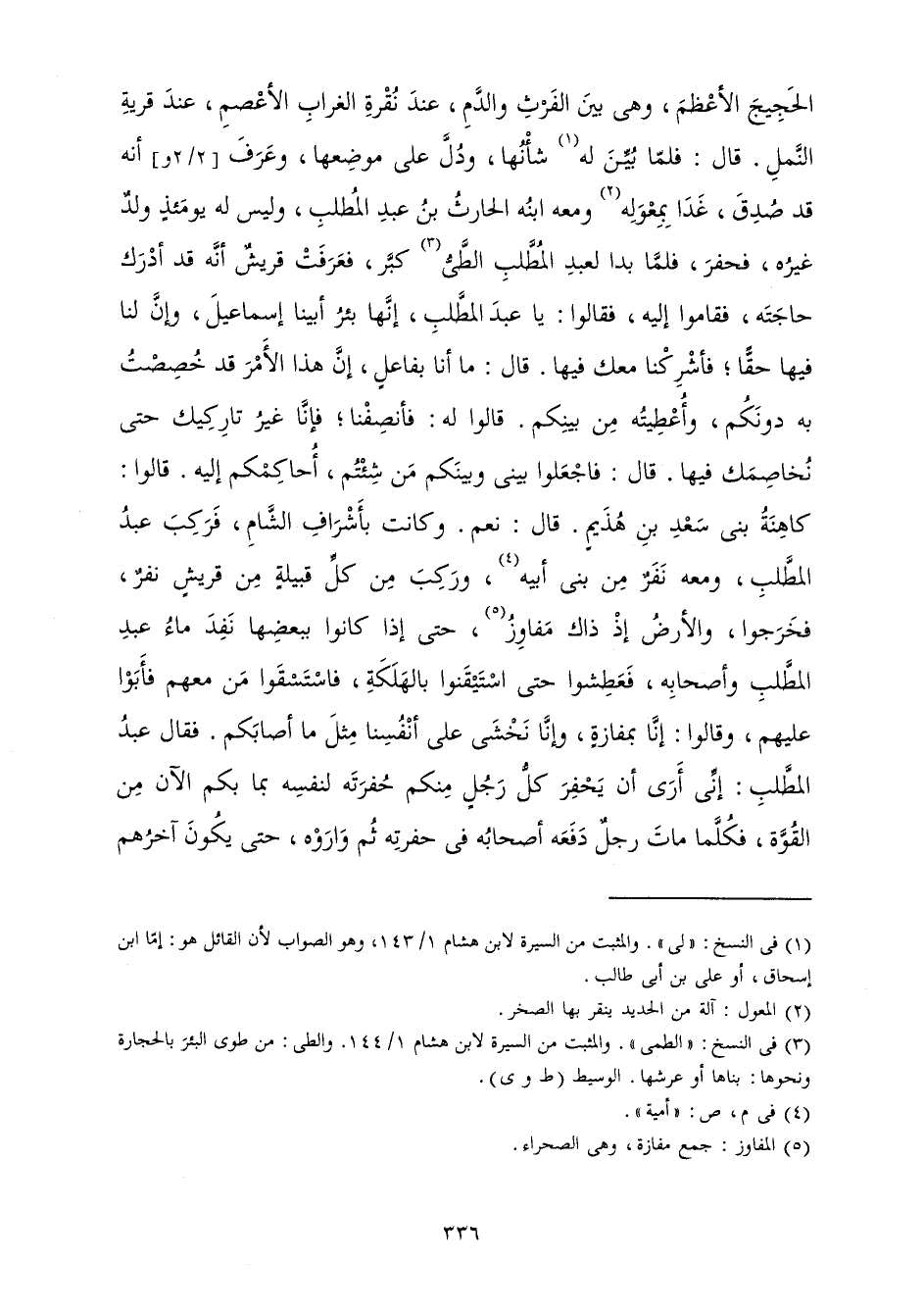 وَهِيَ بَيْنَ الْفَرْثِ وَالدَّمِ، عِنْدَ نُقْرَةِ الْغُرَابِ الْأَعْصَمِ، عِنْدَ قَرْيَةِ النَّمْلِ. قَالَ: فَلَمَّا بَيَّنَ لِي شَأْنَهَا، وَدَلَّ عَلَى مَوْضِعِهَا، وَعَرَفَ أَنَّهُ قَدْ صُدِقَ، غَدًا بِمِعْوَلِهِ، وَمَعَهُ ابْنُهُ الْحَارِثُ بْنُ عَبْدِ الْمُطَّلِبِ - وَلَيْسَ لَهُ يَوْمئِذٍ وَلَدٌ غَيْرُهُ - فَحَفَرَ فَلَمَّا بَدَا لِعَبْدِ الْمُطَّلِبِ الطَّيُّ كَبَّرَ فَعَرَفَتْ قُرَيْشٌ أَنَّهُ قَدْ أَدْرَكَ حَاجَتَهُ فَقَامُوا إِلَيْهِ فَقَالُوا: يَا عَبْدَ الْمُطَّلِبِ إِنَّهَا بِئْرُ أَبِينَا إِسْمَاعِيلَ، وَإِنَّ لَنَا فِيهَا حَقًّا فَأَشْرِكْنَا مَعَكَ فِيهَا. قَالَ: مَا أَنَا بِفَاعِلٍ، إِنَّ هَذَا الْأَمْرَ قَدْ خُصِصْتُ بِهِ دُونَكُمْ، وَأُعْطِيتُهُ مِنْ بَيْنِكُمْ، قَالُوا لَهُ: فَأَنْصِفْنَا فَإِنَّا غَيْرُ تَارِكِيكَ حَتَّى نُخَاصِمَكَ فِيهَا. قَالَ: فَاجْعَلُوا بَيْنِي وَبَيْنَكُمْ مَنْ شِئْتُمْ أُحَاكِمْكُمْ إِلَيْهِ. قَالُوا: كَاهِنَةُ بَنِي سَعْدِ بْنِ هُذَيْمٍ. قَالَ: نَعَمْ. وَكَانَتْ بِأَشْرَافِ الشَّامِ فَرَكِبَ عَبْدُ الْمُطَّلِبِ، وَمَعَهُ نَفَرٌ مِنَ بَنِي أُمَيَّةَ، وَرَكِبَ مِنْ كُلِّ قَبِيلَةٍ مِنْ قُرَيْشٍ نَفَرٌ فَخَرَجُوا وَالْأَرْضُ إِذْ ذَاكَ مَفَاوِزُ حَتَّى إِذَا كَانُوا بِبَعْضِهَا نَفَدَ مَاءُ عَبْدِ الْمُطَّلِبِ وَأَصْحَابُهُ فَعَطِشُوا حَتَّى اسْتَيْقَنُوا بِالْهَلَكَةِ فَاسْتَسْقَوْا مَنْ مَعَهُمْ فَأَبَوْا عَلَيْهِمْ، وَقَالُوا: إِنَّا بِمَفَازَةٍ، وَإِنَّا نَخْشَى عَلَى أَنْفُسِنَا مِثْلَ مَا أَصَابَكُمْ.