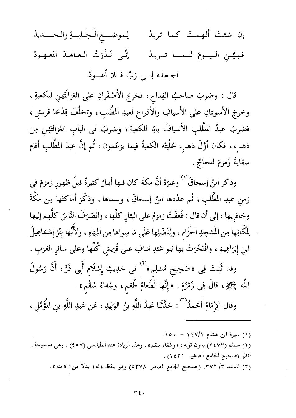 إِنْ شِئْتَ أَلْهَمْتَ كَمَا تُرِيدْ لِمَوْضِعِ الْحِلْيَةِ وَالْحَدِيدْ فَبَيِّنِ الْيَوْمَ لِمَا تُرِيدْ إِنِّي نَذَرْتُ الْعَاهِدَ الْمَعْهُودْ اجْعَلْهُ لِي رَبِّ فَلَا أَعُودْ قَالَ: وَضَرَبَ صَاحِبُ الْقِدَاحِ فَخَرَجَ الْأَصْفَرَانِ عَلَى الْغَزَالَتَيْنِ لِلْكَعْبَةِ، وَخَرَجَ الْأَسْوَدَانِ عَلَى الْأَسْيَافِ وَالْأَدْرَاعِ لِعَبْدِ الْمُطَّلِبِ، وَتَخَلَّفَ قَدَحَا قُرَيْشٍ فَضَرَبَ عَبْدُ الْمُطَّلِبِ الْأَسْيَافَ بَابًا لِلْكَعْبَةِ، وَضَرَبَ فِي الْبَابِ الْغَزَالَتَيْنِ مِنْ ذَهَبٍ فَكَانَ أَوَّلَ ذَهَبٍ حُلِّيَتْهُ الْكَعْبَةُ - فِيمَا يَزَعُمُونَ - ثُمَّ إِنَّ عَبْدَ الْمُطَّلِبِ أَقَامَ سِقَايَةَ زَمْزَمَ لِلْحَاجِّ.