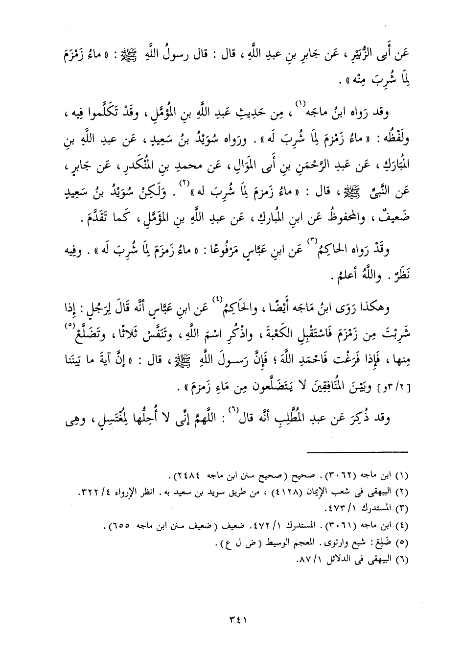 وَقَدْ رَوَاهُ ابْنُ مَاجَهْ مِنْ حَدِيثِ عَبْدِ اللَّهِ بْنِ الْمُؤَمَّلِ وَقَدْ تَكَلَّمُوا فِيهِ، وَلَفْظُهُ «مَاءُ زَمْزَمَ لِمَا شُرِبَ لَهُ» وَرَوَاهُ سُوَيْدُ بْنُ سَعِيدٍ عَنْ عَبْدِ اللَّهِ بْنِ الْمُبَارَكِ عَنْ عَبْدِ الرَّحْمَنِ بْنِ أَبِي الْمَوَالِ عَنْ مُحَمَّدِ بْنِ الْمُنْكَدِرِ عَنْ جَابِرٍ عَنِ النَّبِيِّ صَلَّى اللَّهُ عَلَيْهِ وَسَلَّمَ قَالَ: «مَاءُ زَمْزَمَ لِمَا شُرِبَ لَهُ» وَلَكِنْ سُوَيْدُ بْنُ سَعِيدٍ ضَعِيفٌ وَالْمَحْفُوظُ عَنِ ابْنِ الْمُبَارَكِ عَنْ عَبْدِ اللَّهِ بْنِ الْمُؤَمَّلِ كَمَا تَقَدَّمَ.
