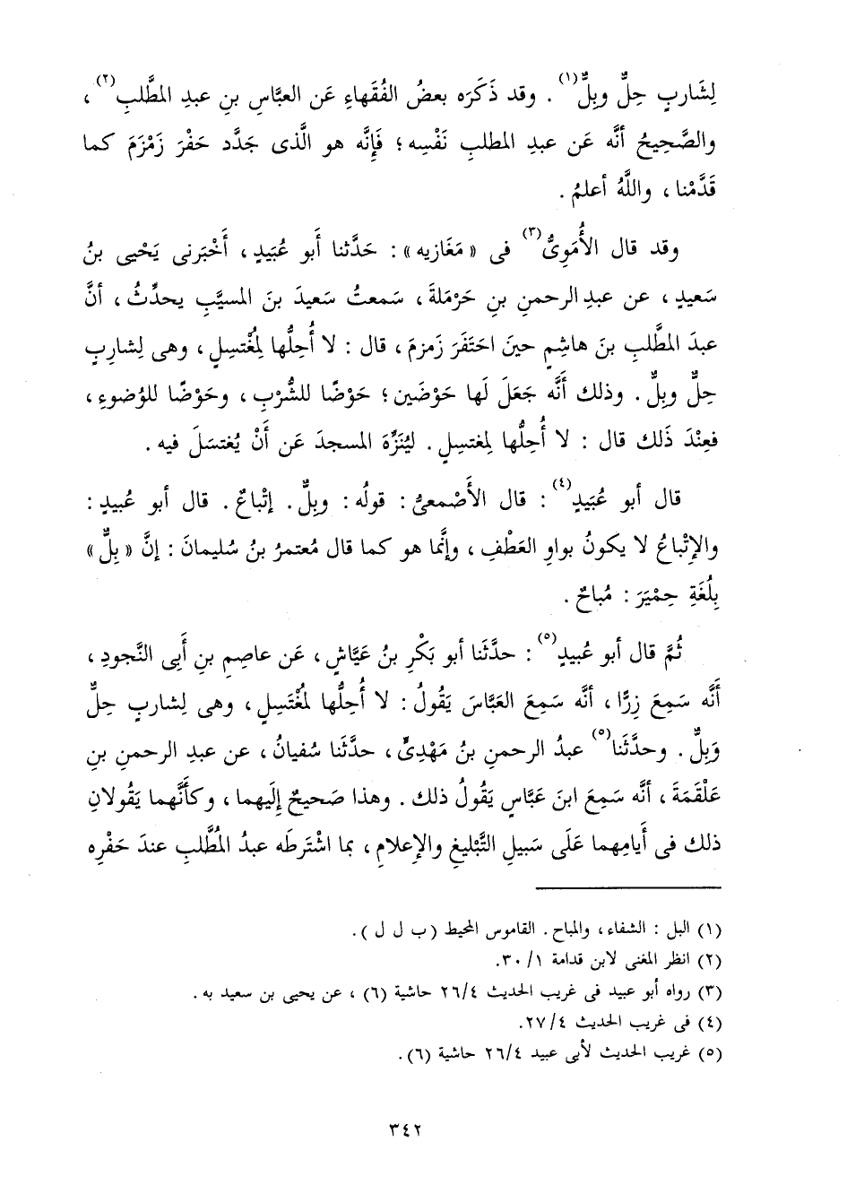 ثُمَّ قَالَ أَبُو عُبَيْدٍ: حَدَّثَنَا أَبُو بَكْرِ بْنُ عَيَّاشٍ عَنْ عَاصِمِ بْنِ أَبِي النَّجُودِ أَنَّهُ سَمِعَ رِزًّا أَنَّهُ سَمِعَ الْعَبَّاسَ يَقُولُ: لَا أُحِلُّهَا لِمُغْتَسِلٍ، وَهِيَ لِشَارِبٍ حِلٌّ وَبِلٌّ. وَحَدَّثَنَا عَبْدُ الرَّحْمَنِ بْنُ مَهْدِيٍّ حَدَّثَنَا سُفْيَانُ عَنْ عَبْدِ الرَّحْمَنِ بْنِ عَلْقَمَةَ أَنَّهُ سَمِعَ ابْنَ عَبَّاسٍ يَقُولُ ذَلِكَ. وَهَذَا صَحِيحٌ إِلَيْهِمَا كَأَنَّهُمَا يَقُولَانِ ذَلِكَ فِي أَيَّامِهِمَا عَلَى سَبِيلِ التَّبْلِيغِ وَالْإِعْلَامِ بِمَا اشْتَرَطَهُ عَبْدُ الْمُطَّلِبِ عِنْدَ حَفْرِهِ