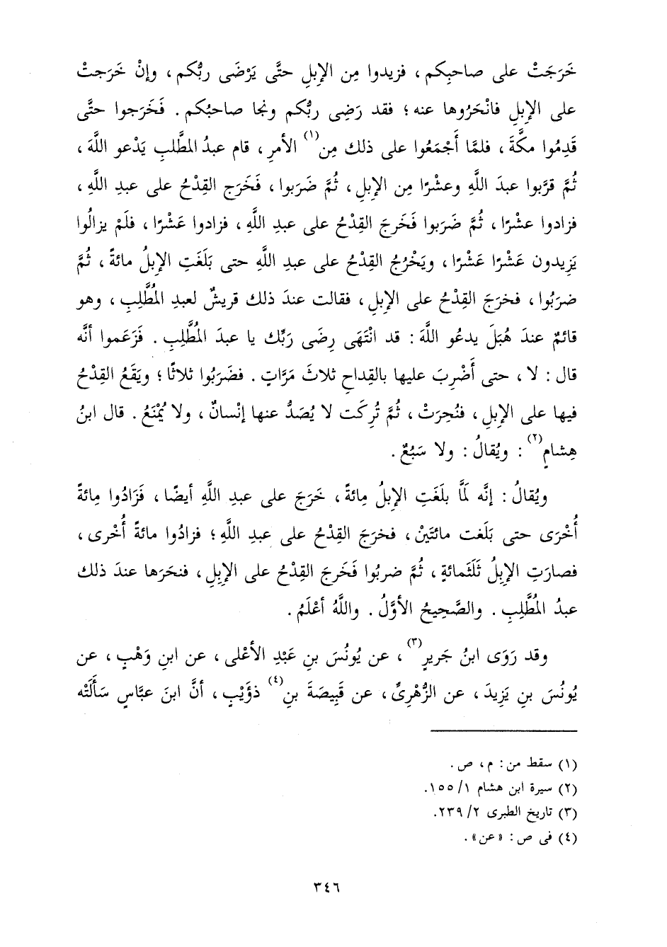 خَرَجَتْ عَلَى صَاحِبِكُمْ فَزِيدُوا مِنَ الْإِبِلِ حَتَّى يَرْضَى رَبُّكُمْ، وَإِنْ خَرَجَتْ عَلَى الْإِبِلِ فَانْحَرُوهَا عَنْهُ فَقَدْ رَضِيَ رَبُّكُمْ وَنَجَا صَاحِبُكُمْ، فَخَرَجُوا حَتَّى قَدِمُوا مَكَّةَ فَلَمَّا أَجْمَعُوا عَلَى ذَلِكَ الْأَمْرِ قَامَ عَبْدُ الْمُطَّلِبِ يَدْعُو اللَّهَ، ثُمَّ قَرَّبُوا عَبْدَ اللَّهِ وَعَشْرًا مِنَ الْإِبِلِ، ثُمَّ ضَرَبُوا فَخَرَجَ الْقِدْحُ عَلَى عَبْدِ اللَّهِ فَزَادُوا عَشْرًا ثُمَّ ضَرَبُوا فَخَرَجَ الْقِدْحُ عَلَى عَبْدِ اللَّهِ فَزَادُوا عَشْرًا فَلَمْ يَزَالُوا يَزِيدُونَ عَشْرًا عَشْرًا، وَيَخْرُجُ الْقِدْحُ عَلَى عَبْدِ اللَّهِ حَتَّى بَلَغَتِ الْإِبِلُ مِائَةً، ثُمَّ ضَرَبُوا فَخَرَجَ الْقِدْحُ عَلَى الْإِبِلِ فَقَالَتْ: عِنْدَ ذَلِكَ قُرَيْشٌ لِعَبْدِ الْمُطَّلِبِ وَهُوَ قَائِمٌ عِنْدَ هُبَلَ يَدْعُو اللَّهَ: قَدِ انْتَهَى رِضَى رَبِّكَ يَا عَبْدَ الْمُطَّلِبِ فَزَعَمُوا أَنَّهُ قَالَ: لَا حَتَّى أَضْرِبَ عَلَيْهَا بِالْقِدَاحِ ثَلَاثَ مَرَّاتٍ فَضَرَبُوا ثَلَاثًا وَيَقَعُ الْقِدْحُ فِيهَا عَلَى الْإِبِلِ فَنُحِرَتْ ثُمَّ تُرِكَتْ لَا يُصَدُّ عَنْهَا إِنْسَانٌ وَلَا يُمْنَعُ. قَالَ ابْنُ هِشَامٍ: وَيُقَالَ: وَلَا سَبْعٌ.