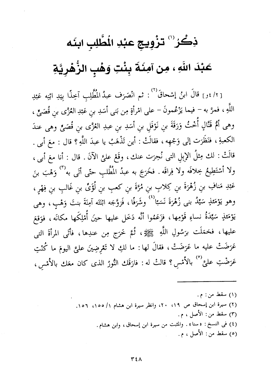 قَالَ ابْنُ إِسْحَاقَ: ثُمَّ انْصَرَفَ عَبْدُ الْمُطَّلِبِ آخِذًا بِيَدِ ابْنِهِ عَبْدِ اللَّهِ فَمَرَّ بِهِ - فِيمَا يَزْعُمُونَ - عَلَى امْرَأَةٍ مِنْ بَنِي أَسَدِ بْنِ عَبْدِ الْعُزَّى بْنِ قُصَيٍّ، وَهِيَ أُمُّ قَنَّالٍ أُخْتُ وَرَقَةَ بْنِ نَوْفَلِ بْنِ أَسَدِ بْنِ عَبْدِ الْعُزَّى بْنِ قُصَيٍّ، وَهِيَ عِنْدَ الْكَعْبَةِ فَنَظَرَتْ إِلَى وَجْهِهِ فَقَالَتْ: أَيْنَ تَذْهَبُ يَا عَبْدَ اللَّهِ؟ قَالَ: مَعَ أَبِي قَالَتْ: لَكَ مِثْلُ الْإِبِلِ الَّتِي نُحِرَتْ عَنْكَ وَقَعْ عَلَيَّ الْآنَ. قَالَ: أَنَا مَعَ أَبِي وَلَا أَسْتَطِيعُ خِلَافَهُ وَلَا فِرَاقَهُ. فَخَرَجَ بِهِ عَبْدُ الْمُطَّلِبِ حَتَّى أَتَى وَهْبَ بْنَ عَبْدِ مَنَافِ بْنِ زُهْرَةَ بْنِ كِلَابِ بْنِ مُرَّةَ بْنِ كَعْبِ بْنِ لُؤَيِّ بْنِ غَالِبِ بْنِ فِهْرٍ، وَهُوَ يَوْمَئِذٍ سَيِّدُ بَنِي زُهْرَةَ سِنًّا وَشَرَفًا فَزَوَّجَهُ ابْنَتَهُ آمِنَةَ بِنْتَ وَهْبٍ وَهِيَ يَوْمَئِذٍ سَيِّدَةُ نِسَاءِ قَوْمِهَا فَزَعَمُوا أَنَّهُ دَخَلَ عَلَيْهَا حِينَ أُمْلِكَهَا مَكَانَهُ فَوَقَعَ عَلَيْهَا فَحَمَلَتْ مِنْهُ بِرَسُولِ اللَّهِ صَلَّى اللَّهُ عَلَيْهِ وَسَلَّمَ، ثُمَّ خَرَجَ مِنْ عِنْدِهَا فَأَتَى الْمَرْأَةَ الَّتِي عَرَضَتْ عَلَيْهِ مَا عَرَضَتْ فَقَالَ لَهَا: مَا لَكِ لَا تَعْرِضِينَ عَلَيَّ الْيَوْمَ مَا كُنْتِ عَرَضْتِ بِالْأَمْسِ؟ قَالَتْ لَهُ: فَارَقَكَ النُّورُ الَّذِي كَانَ مَعَكَ بِالْأَمْسِ،